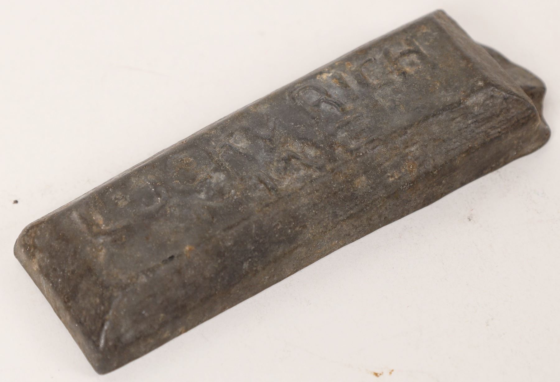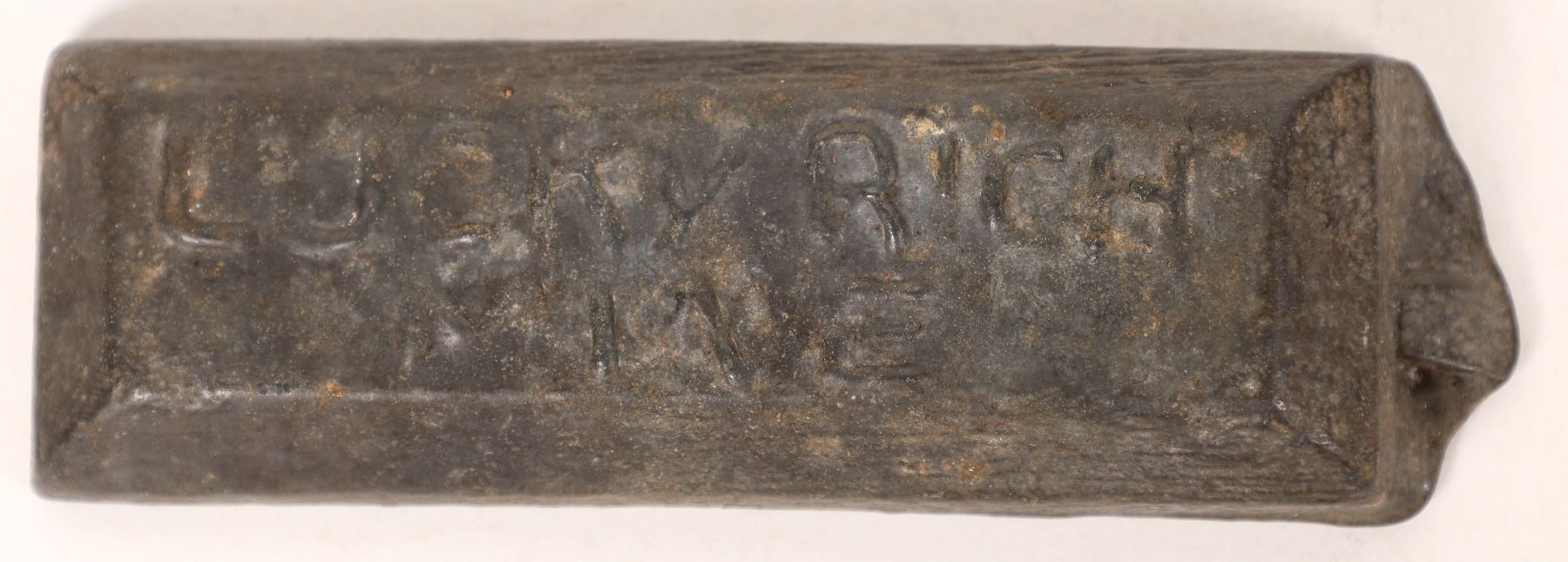 Lucky Rich Mine (Death Valley?) ingot; 4 x 1 1/2 x 1/2 inches. 17.4 ounces. Not a precious metal ingot, probably (lead?) a presentation ingot for investors. The only Lucky Rich Mine we found was a copper mine in Inyo County, but this is not a copper ingot.