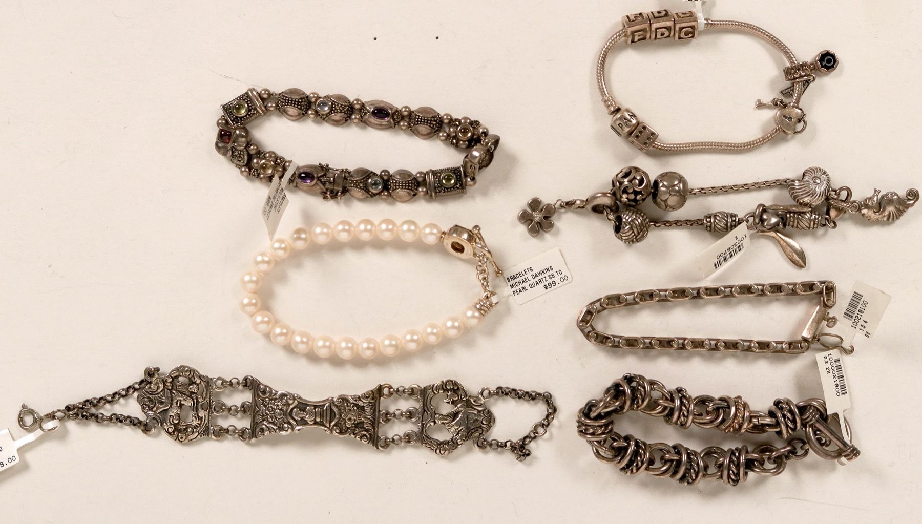 Nice collection of seven sterling bracelets, some with pearls, some with stones. The combined weight of this group is a hefty 229 Grams. All are in nice condition, ready to wear. See photos for more details.