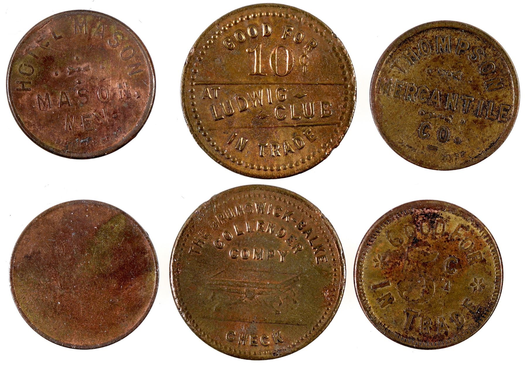 Lot of three Nevada tokens. 1) GOOD FOR / 10¢ / AT / LUDWIG / CLUB / IN TRADE // THE BRUNSWICK-BALKE / COLLENDER / COMPY / CHECK; Br., Rd., 25 mm. 2) HOTEL MASON / MASON, / NEV. / PATRICK & CO. S.F. // (blank); Br. rd., 21 mm. 3) THOMPSON / MERCANTILE / CO. / PATRICK & CO. S.F. // GOOD FOR / 5c / IN TRADE; Br., rd., 21 mm.