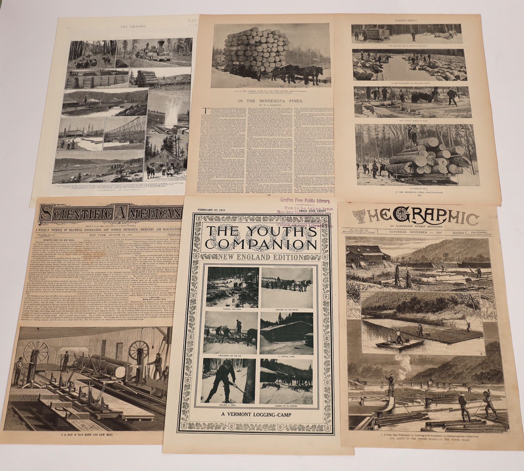 Early Newspaper Articles & Illustrations on Lumber: 1) The Youths Companion (cover), February 27, 1913 "A Vermont Logging Camp", (6 Illus., 16"h x 10-1/2"w). 2) Scientific American, (cover), August 13, 1881 "J. A. Fay & Co.'s Band Log Saw Mill" (illus. + article, 15-1/2"h x 10"w). 3) The Graphic (cover), November 11, 1876 "The Timber Trade", (3 illus., 15"h x 10"w). 4) The Graphic, January 31, 1885 "Lumbering in California", (10 Sketches, 16"h x 11"w). 5) Harper's Weekly, 1893 "In the Minnesota Pines", (3 pages, article + 8 illus., 15-1/2"h x 10-1/2" w).
