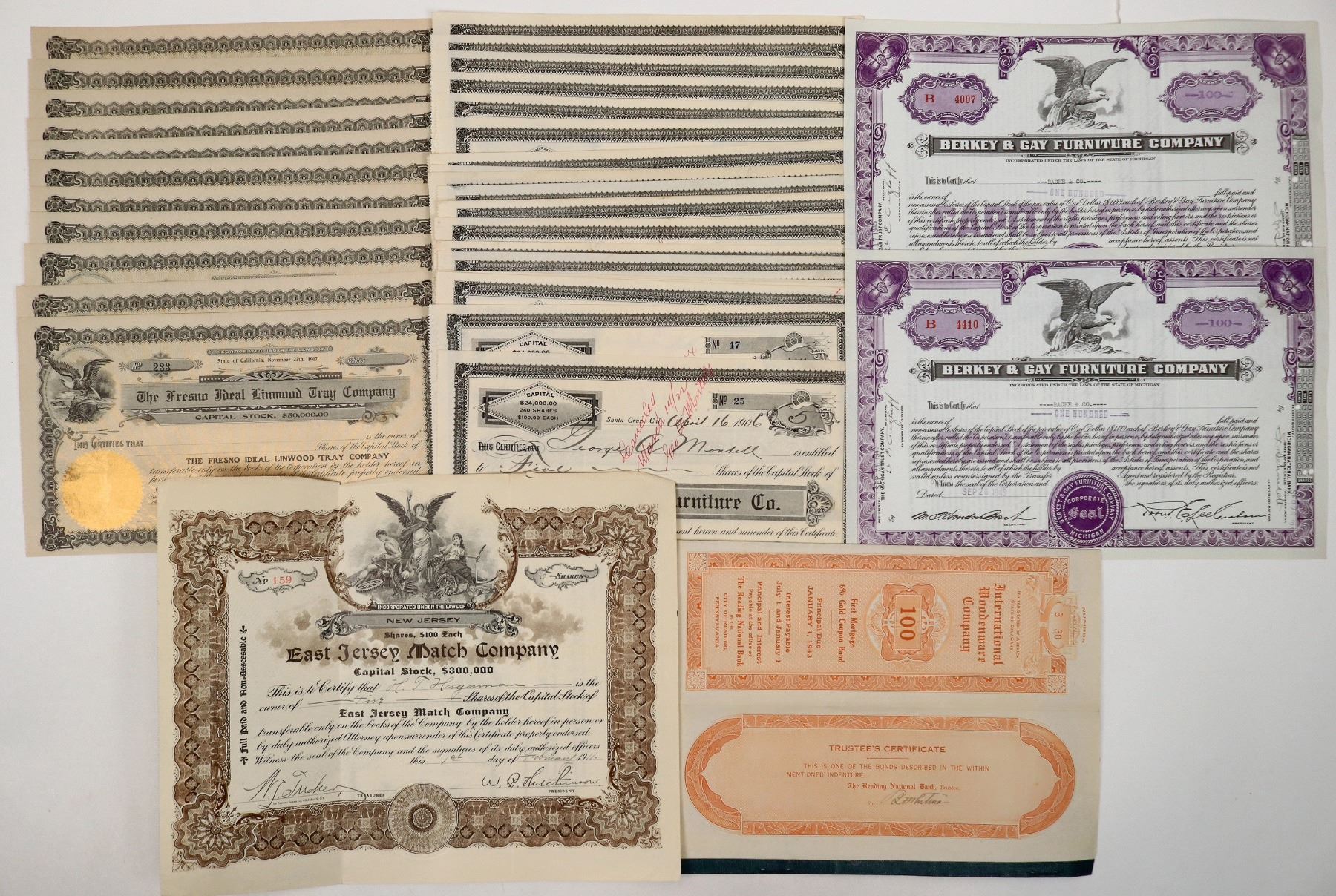 Bond-1923 $100 International Woodenware. Stocks-2x 1945 Berkey & Gay Furniture, 1x 1911 East Jersey Match. 8x 1908-22 Pacific Coast Furniture, Unissued-5x Pacific Coast Furniture, 11x Fresno Ideal Linwood Tray.