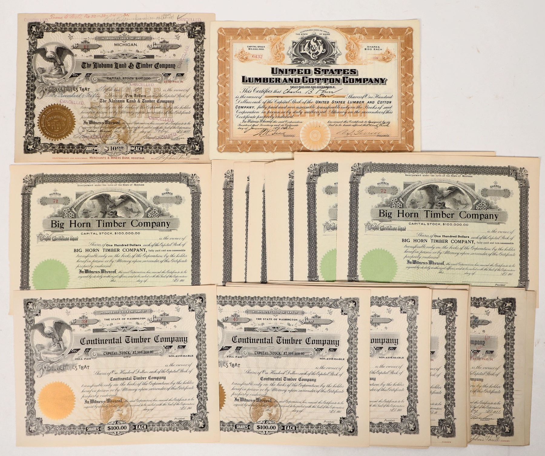 Unissued- about 25 Alabama Land & Timber, about 15 Continental Timber, about 35 Big Horn Timber. Issued-2x 1922 US Lumber and Cotton.