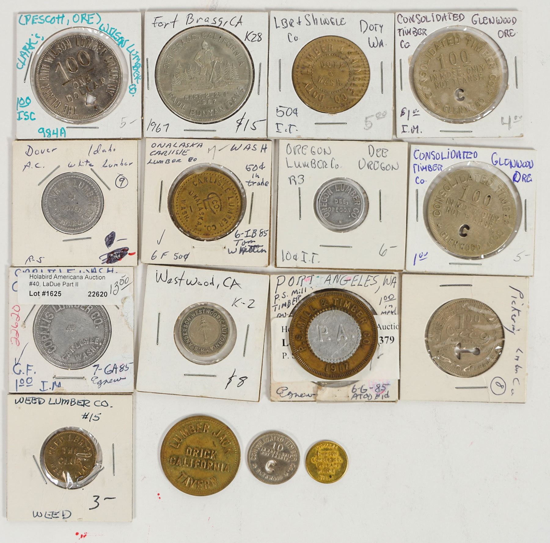 Sixteen lumber tokens: Lumber Jack Tavern, Orick, CA; Consolidated Timber, Glenwood, OR; Oregon Lumber, Dee, OR; Paul Bunyan Days, Fort Bragg; P. S. Mill & Timber, Port Angeles, WA; Doty Lumber & Shingle, Doty, WA; Clark & Wilson Lumber, Prescott, OR; Weed Lumber Co., Weed, CA; H. S. Anderson, Westwood, CA; Johnson Lumber , Dedham, Maine; A. C. White Lumber, Dover Idaho, many more.