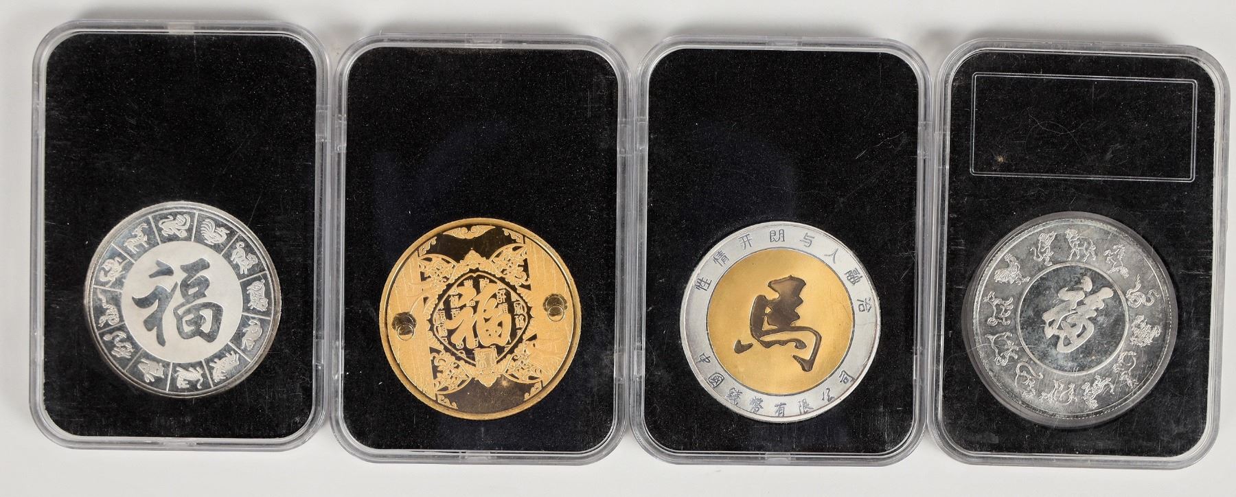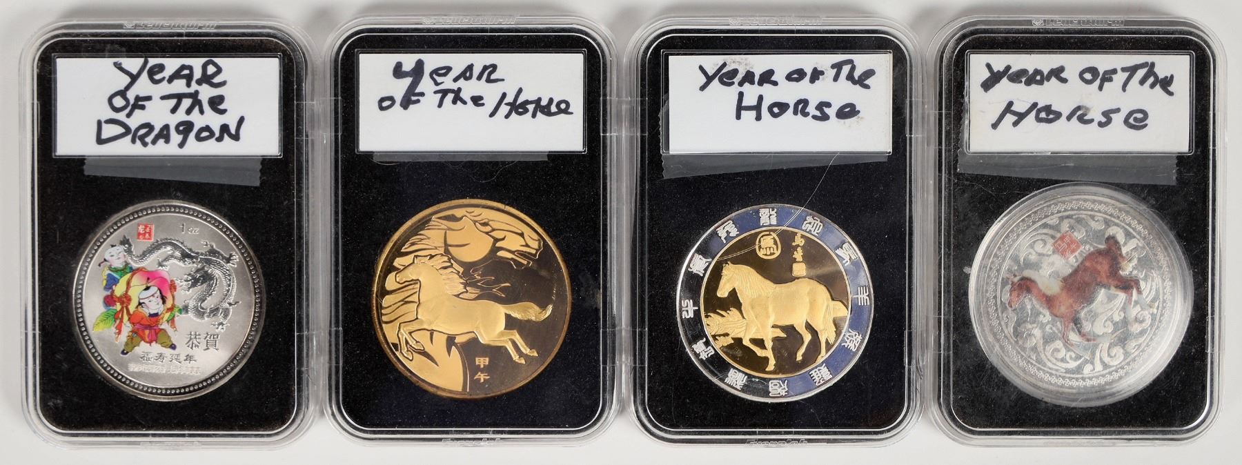 Four medals: three Year of the Horse, one Year of the Dragon. Two are enameled, two accented with gold. None are marked silver, although two appear to be silver. In hard plastic cases.