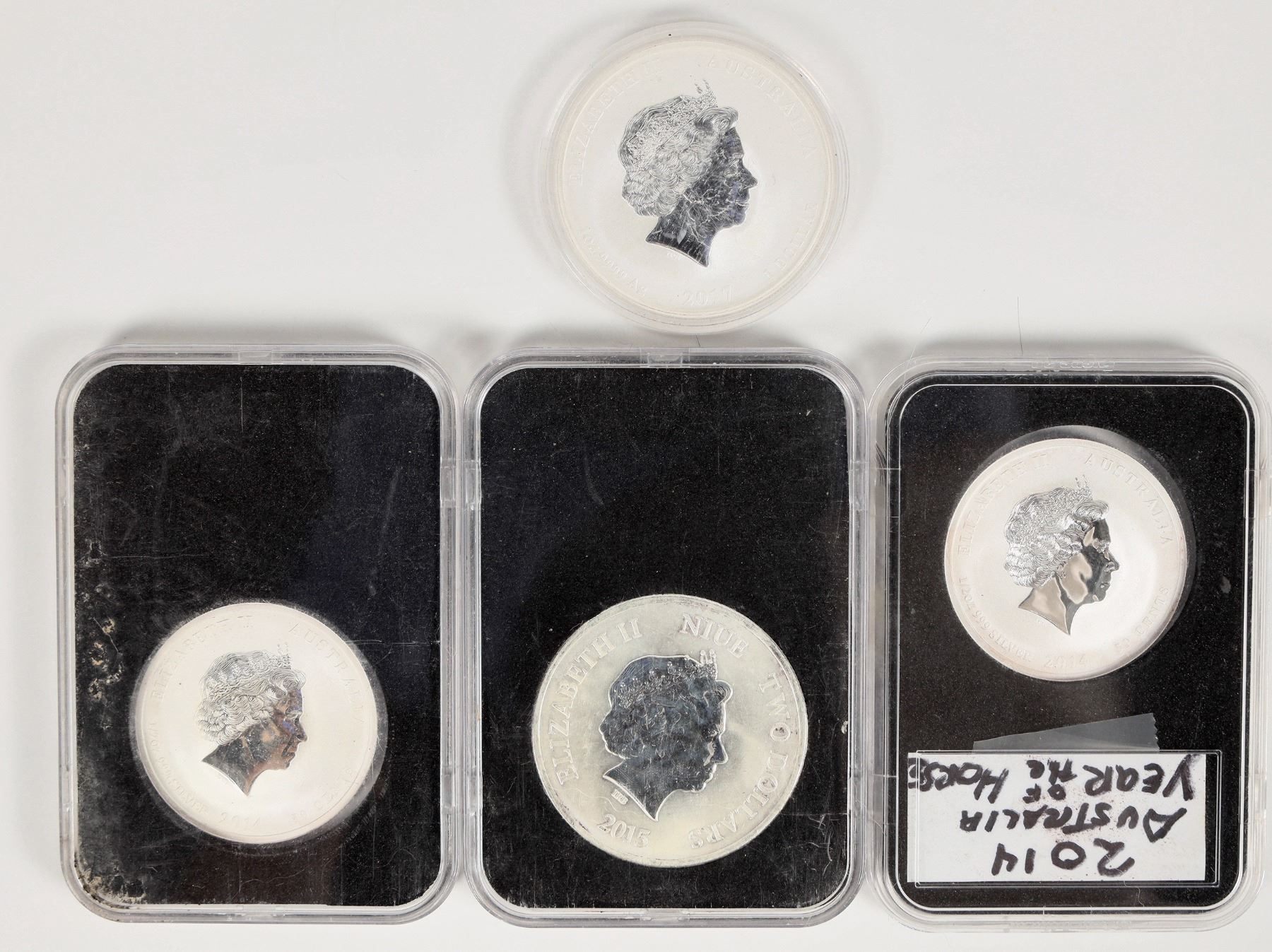 Four silver coins: 2015 Niue two dollar Year of the Goat one ounce; 2017 Australia one dollar Year of the Dragon one ounce; 2014 Australia fifty cent Year of the Horse half ounce (2).