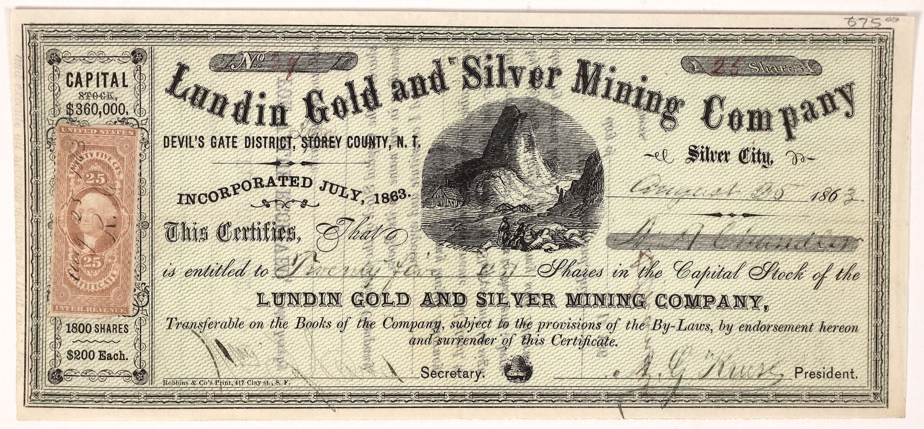Lundin Gold and Silver Mining Company - Devils Gate Mining District - Storey County, N.T. - Certificate #29 for 25 shares made out to N. (Newton) A. (Amos) Chandler and datelined Silver City August 25, 1863. Incorporated July 1863 and capitalized at $360,000; 1800 shares at $200 per. Signed by secretary, (illegible) and President, B. G. Kruse. A vignette of a mountain with a cabin and two men in the foreground. Small beehive at bottom. A rare partially imperforate 25-cent brown 'Certificate" stamp affixed to the left. Chandler took part in the 1860 expedition with Major Ormsby against the Pah-Ute Indians after burning Williams Station. He was the only one to survive by jumping off a cliff into the Truckee River.