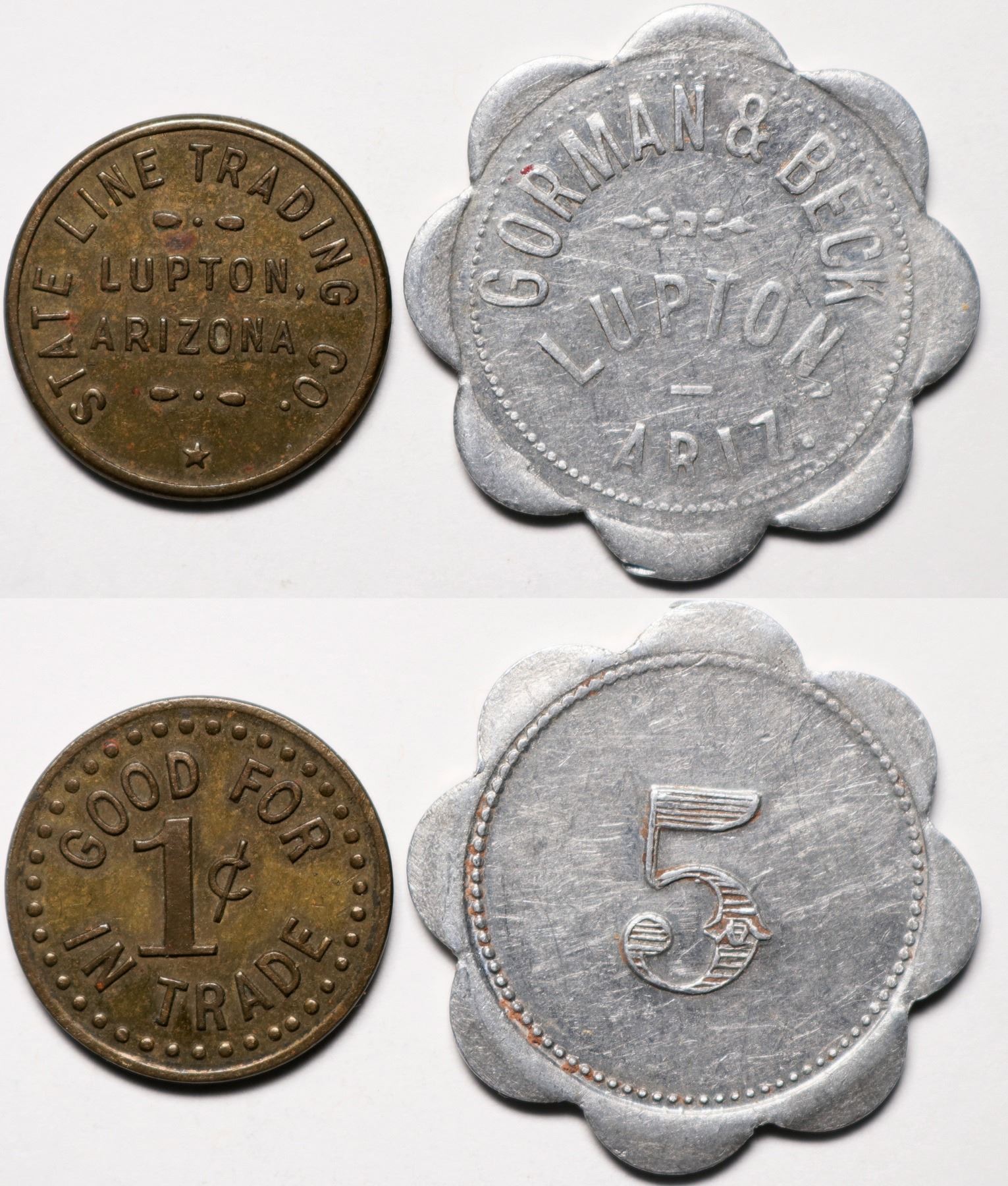Lot of 2. 1) State Line Trading Co. / Lupton, / Arizona // Good for / 1c / in trade. 2) Gorman and Beck / Lupton, / Ariz. // 5. Scalloped 8 lobed about 30mm in diameter. Trade token once used by proprietors "GORMAN & BECK" who operated a Native American Indian trading post located in Lupton Arizona. Lupton is located in Apache County....but in Native American Navajo region. Condition is problem free.