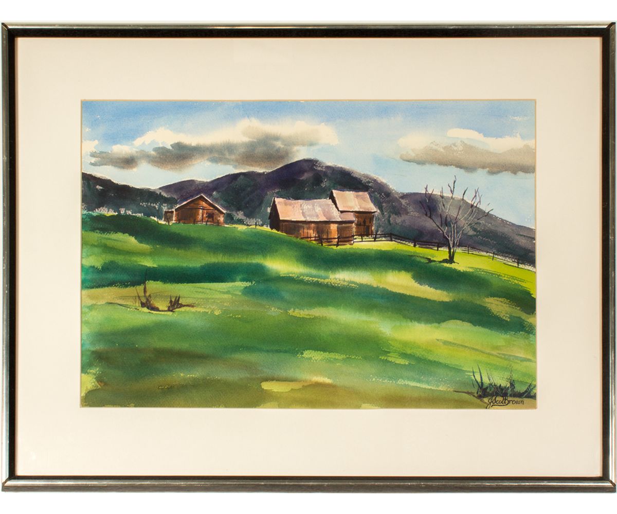 Watercolor Landscape painting by Joan Scott Brown. (framed size: 22.5" H x 22.75" W). View is from large green hillside in foreground and cabins and mountains in background.