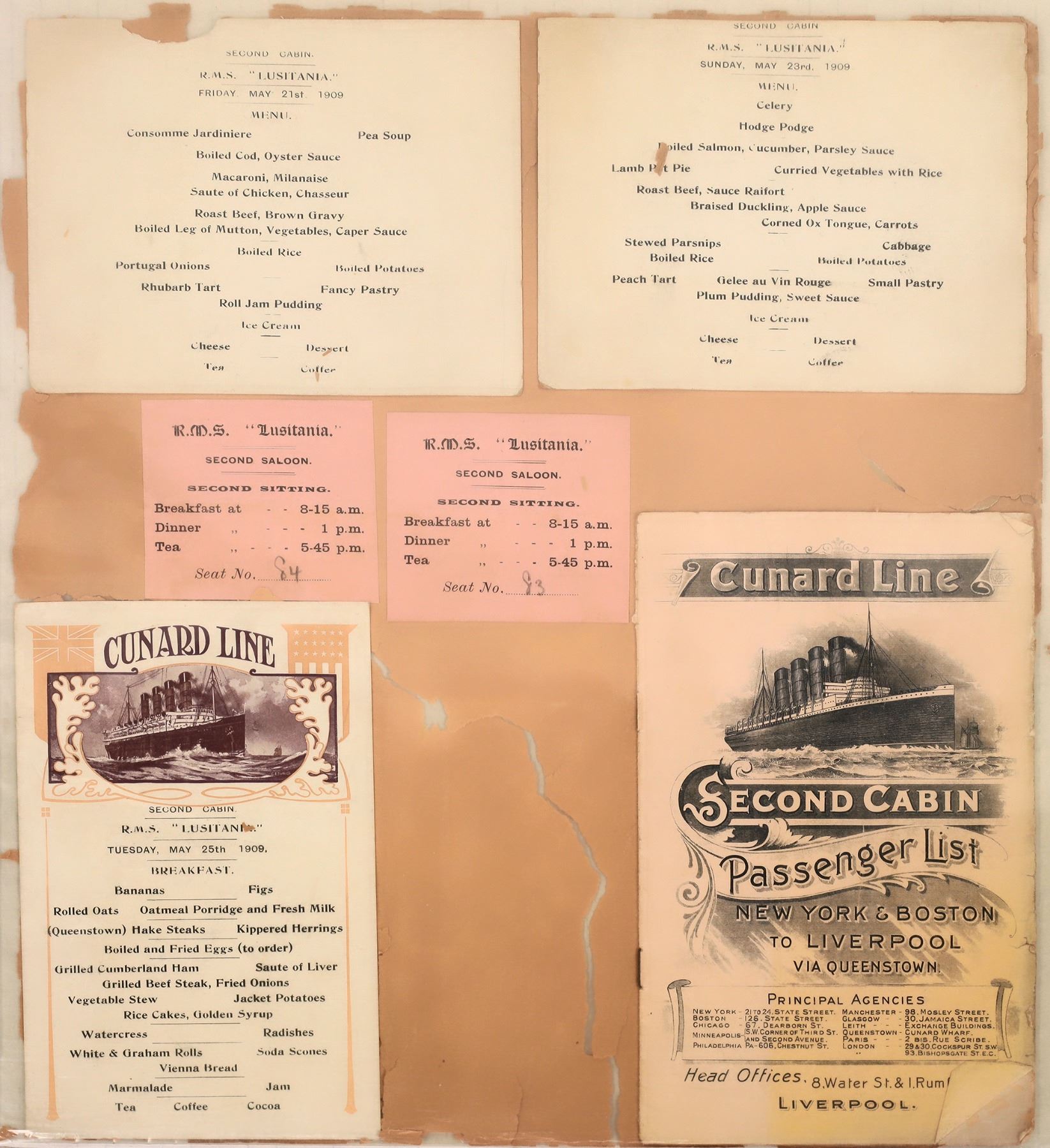 6 pieces of paper ephemera from a May 1909 voyage of the RMS Lusitania of the Cunard Line. The ephemera is attached to a scrap album, page and includes 3 second cabin menus for may 21, 22, 23, 1909, a passenger list booklet, and 2 tickets to the 2nd saloon. The Lusitania was sunk in 1915 by the Germans causing the start of WWI.