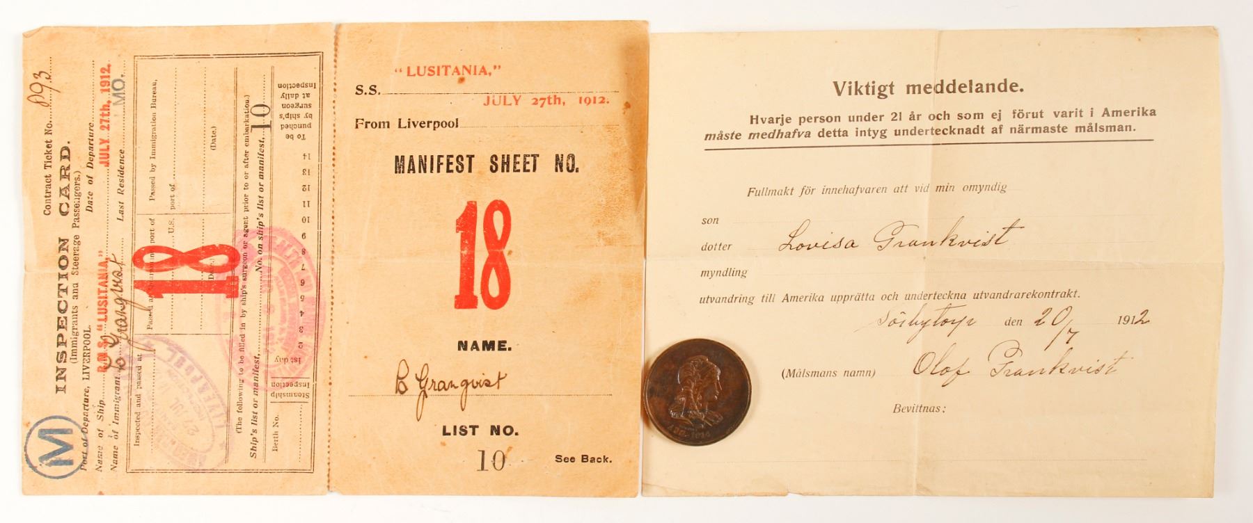 C. Granquist was on list no. 10 from Liverpool July 27th, 1912. This inspection card was to be worn upon arrival in New York. Also a bronze token dated Aug. 1914 with a reverse: Remember the Lusitania / I Will / Never Sail / On A / German /Ship / Remember Belgium. 33 mm. The RMS Lusitania was a British ocean liner and briefly the world's largest passenger ship. The ship was sunk on 7 May 1915 by a German U-boat 11 mi off the southern coast of Ireland. The sinking presaged the United States declaration of war on Germany in 1917. Salvatore Falcone Collection. State: City: Date: