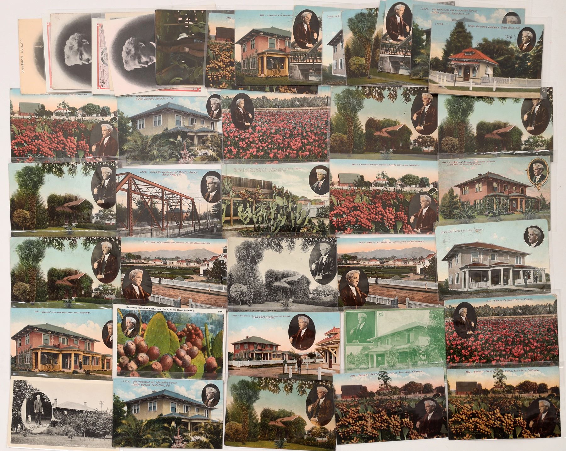 The cards are chromo-litho cards in color. All feature a small cameo portrait photo of Luther Burbank. These are very attractive tinted cards with some duplication. Most of the cards show his home and gardens in Santa Rosa. 41 postcards in total. Some are postmarked from 1907-1920. State:California City:Santa Rosa Date: Provenance: Ken Prag Collection