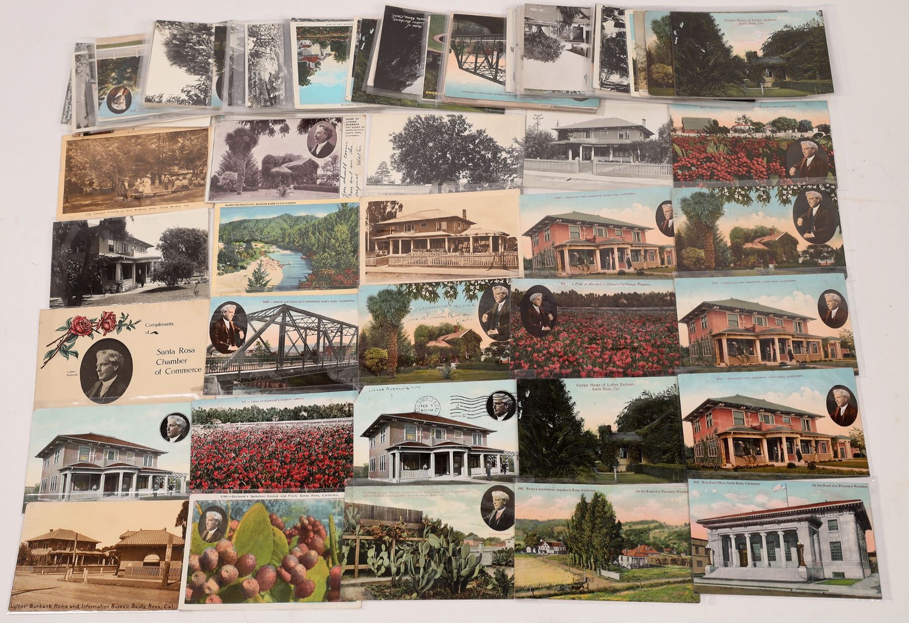 Lot of 50 plus. Color, B/w, some RPCs. White borders, a couple of amber cards, one card has per-N-CIA bear logo. Twenty Six postmarked 1905-43 : Santa Rosa, S.F., Crater Lake, CA, Holland, Whittier, Willets, A collection of Luther Burbank's Homes and gardens over different time frames and several angle. Phot cards of the surrounding Santa Rosa countryside. One card titled unearth this Lebanon Cedar rests Luther Burbank Sant Rosa, Califia. State:California City:Santa Rosa Date:1900-45 Provenance: Ken Prag Collection