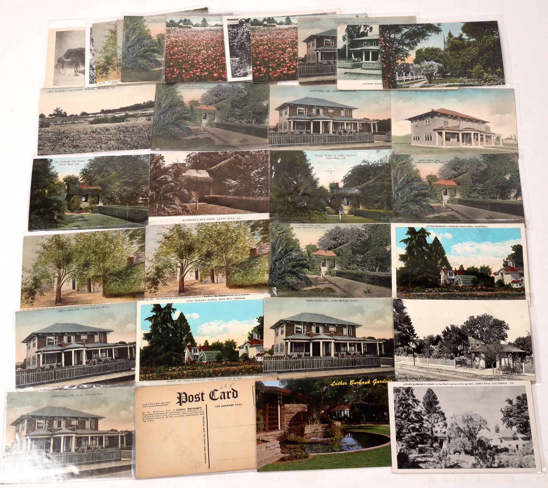 32 postcards total. None are real photo cards. Cards are mostly color or color tinted. Includes nice ivy covered views of Burbank's home as well as his gardens and grounds.
