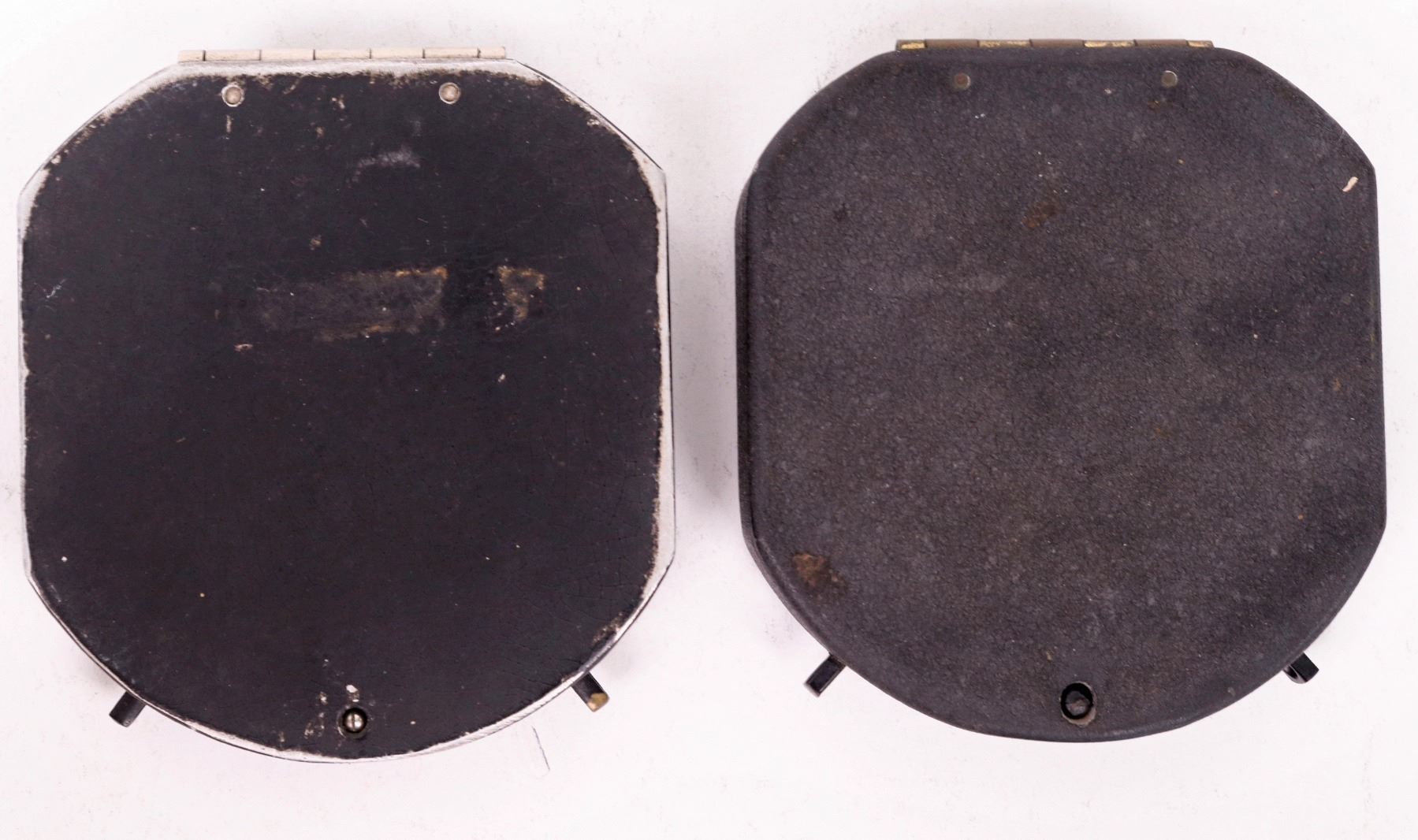 These are two forestry compasses; one Lutz- Geo forestry and one Keuffel & Esser forestry compass. Both are used. The lutz card is bright while the K& E is a slightly yellowed card. 3 in. X 3 in. each. Degree reading is reversed on both. Please see photos for details.