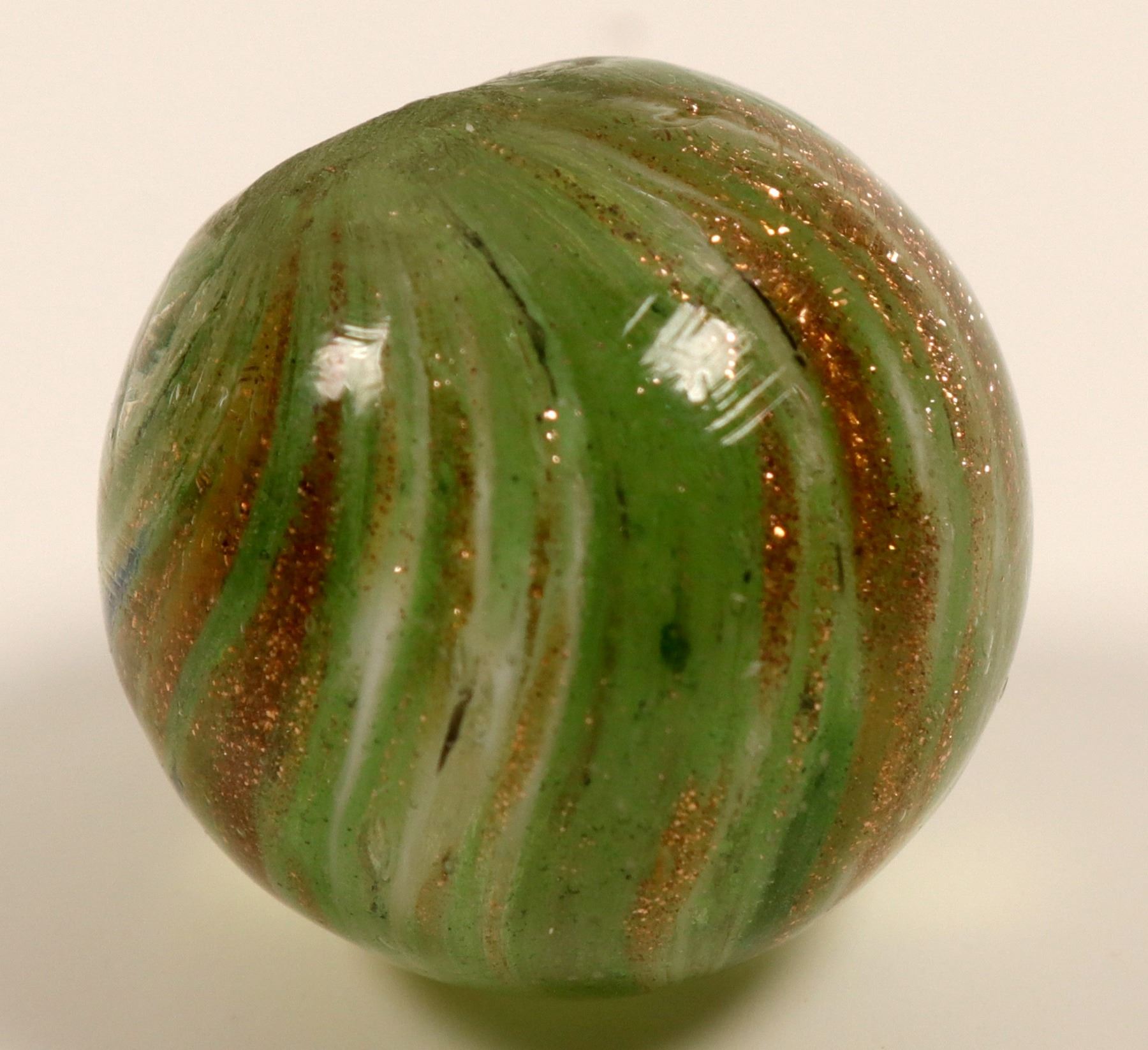 Here it is...Good enough to eat. It is a 3/4", Lutz Onion Skin Marble. Beautiful white and green striping with 80% gold sparkling all through it. Pontiled and perfect ( RH).Stephen Hartman Collection