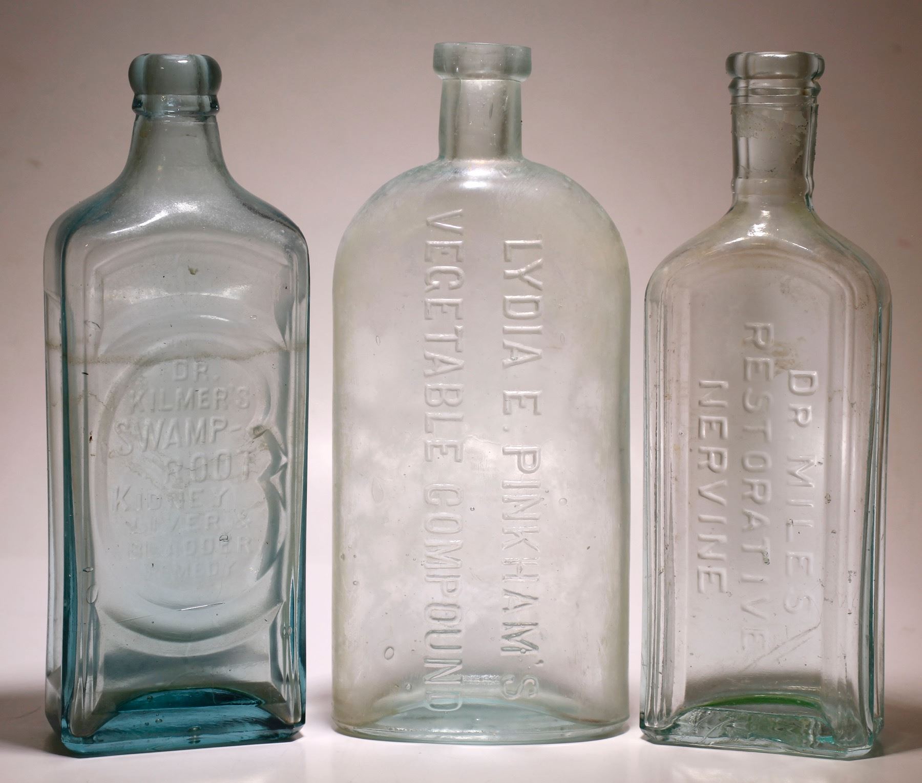 Item # 1 of 3 : Lydia Pimkham 's / Vegetable Compound. Aqua, square collar top, 7 3/8' tall, oval shape, tooled top. Dug specimen, with overall stain, but no damage. Item #2 of 3 : Dr./ Kilmers Swamp- Root/ Kidney / Liver & / Bladder / Remedy // Binhamton , NY// Aqua , rectangular, 8 1/4" tall, rounded collar with a flange.A liile hazy, but no damage. ABM specimen. Lot # 3 of 3 : Dr. Miles / Restorative / Nervine. Aqua, rectangular, 8 3/8" tall. ABM specimen. A little haze in the back shoulder, otherwise nice. Date: 1890's - 1915. City: State: HWAC# 77431