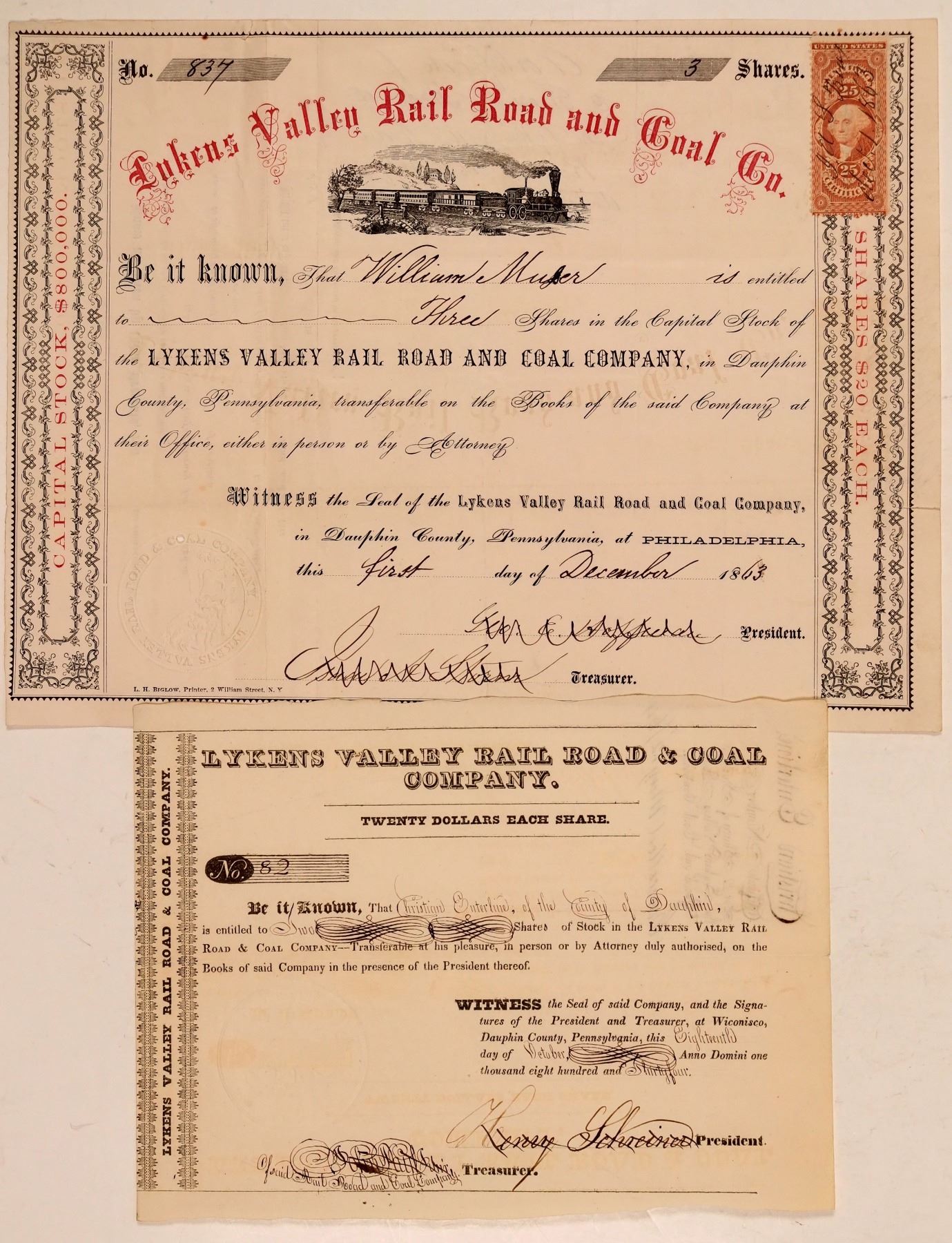 2. #837, I/C, 3 shares @ $20 par issued Dec 1, 1863. Black, embossed seal , vignette 4-4-0 l-r under arched red title, 25c revenue stamp front, L.H. Biglow printer. VF
