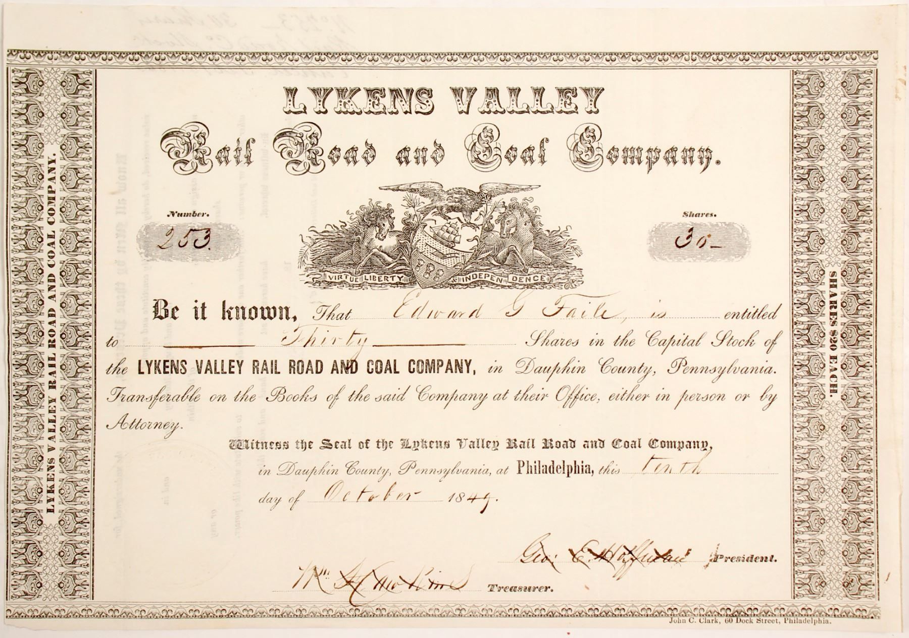 Unknown variety. I/C #253 Edward Faile 30 shares 1849 signed by president Hoffman. Prag Collection State: City: Date: 1849 HWAC# 84926