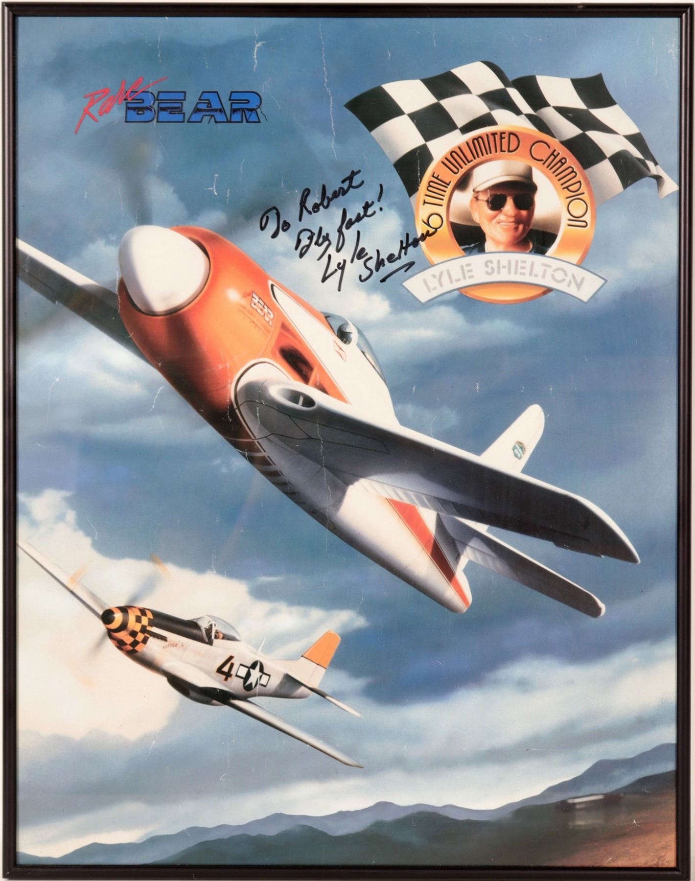 18 x 22" framed print "Race Bear", "6 Time Unlimited Champion/ Lyle Shelton". The print is inscribed and signed "To Robert- Fly Fast! Lyle Shelton" From the Robert Danforth Collection of American Aviation hisotry. The posted has signs of crinkling from rolling. Shelton, 1934-2010 was a Reno Air Races fixture. He was record holder of fixed wing propeller planes at 528+mph.
