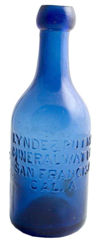 Lynde and Putnam Mineral Waters, San Francisco Cal., Union Glassworks Philadelphia. Deep cobalt, pontil, old soda. This example is one of the few L & P gems, with bold embossing and almost no visible wear on any of the letters. It is a choice example, bright and vibrant. Please inspect. This bottle is one of the earliest California gold rush bottles, produced in the 1850-51 period. Choice.