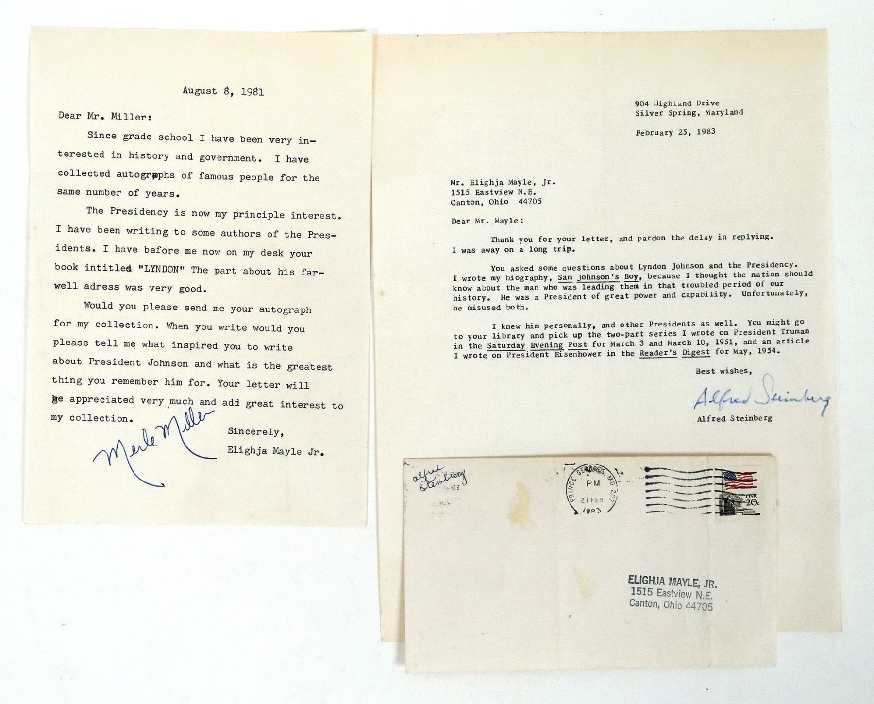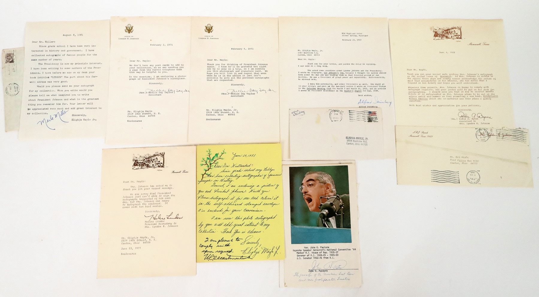 A collection of eight letters between offices and individuals related to the presidency of Lyndon B. Johnson and Mr. Elijah Mayle, a resident of Canton, Ohio. Mayle made a hobby of collecting the autographs of famous individuals, and sought to obtain the autographs of the President and his wife. Included in the collection are: