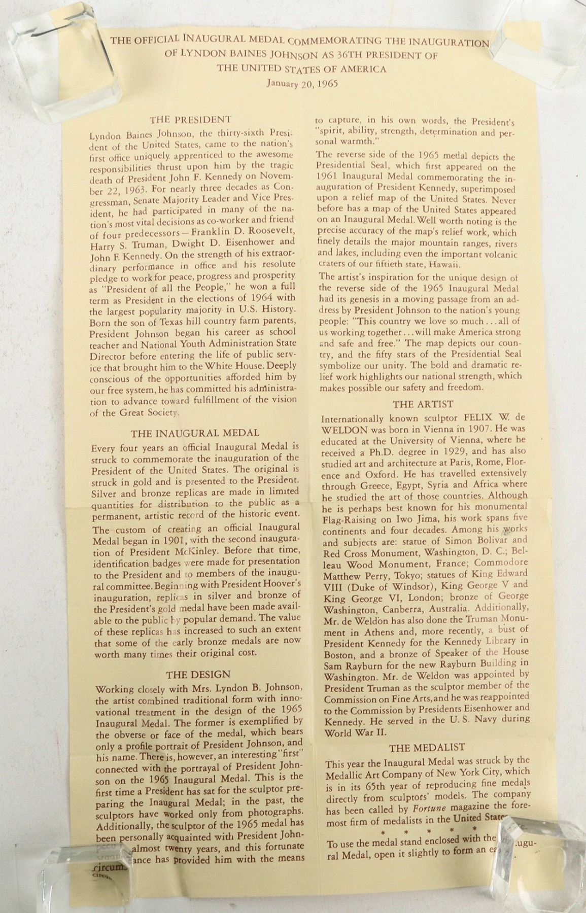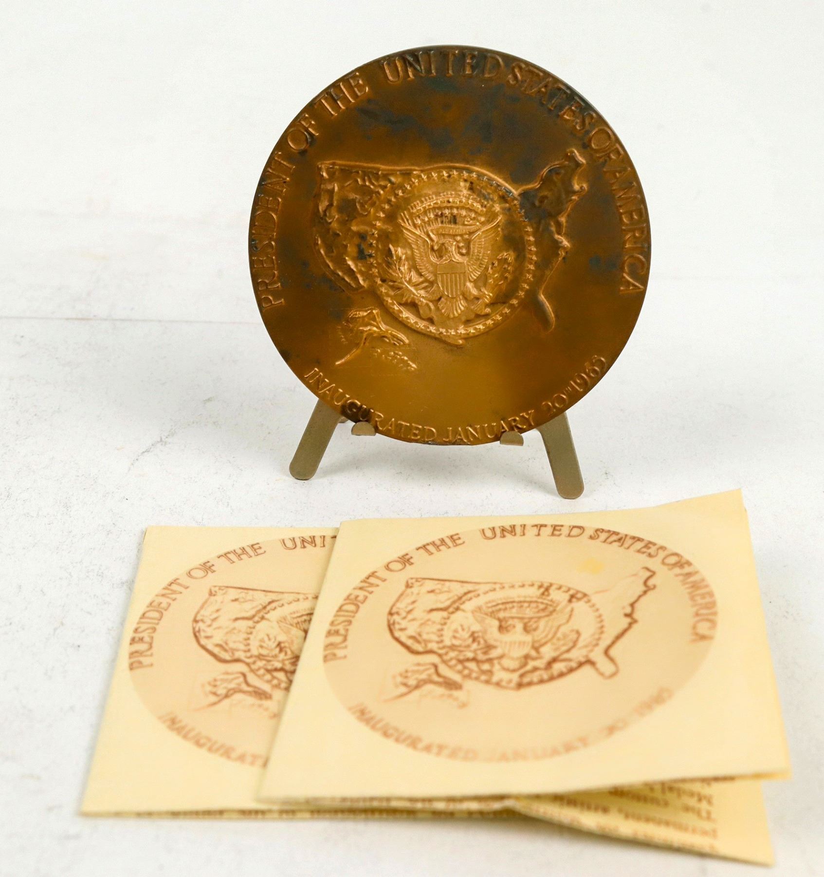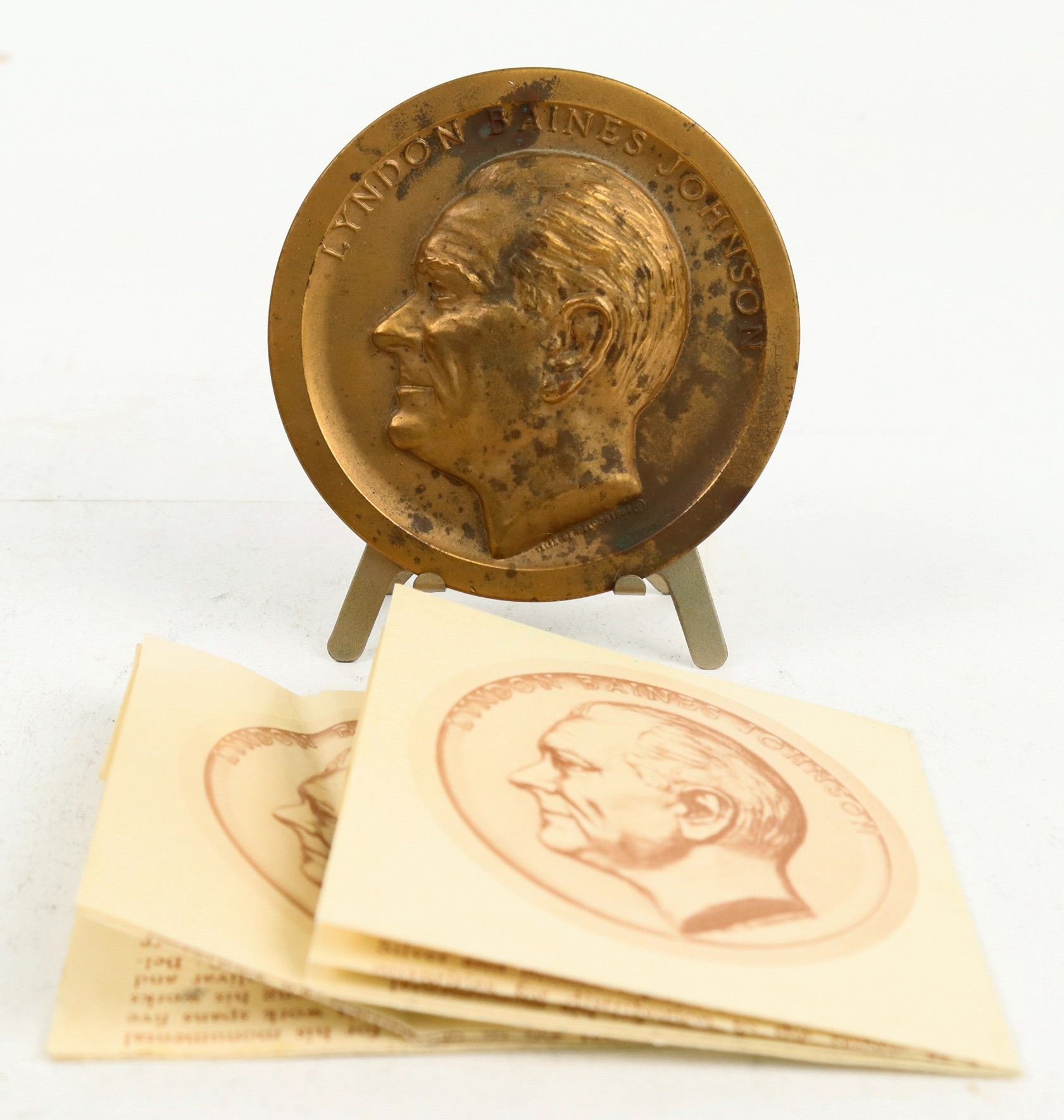 This is an inauguration medal of LBJ presented by Medallic Art Co. at 2.75 in. diameter. Some light staining on both sides. With stand. Please see photo for details.
