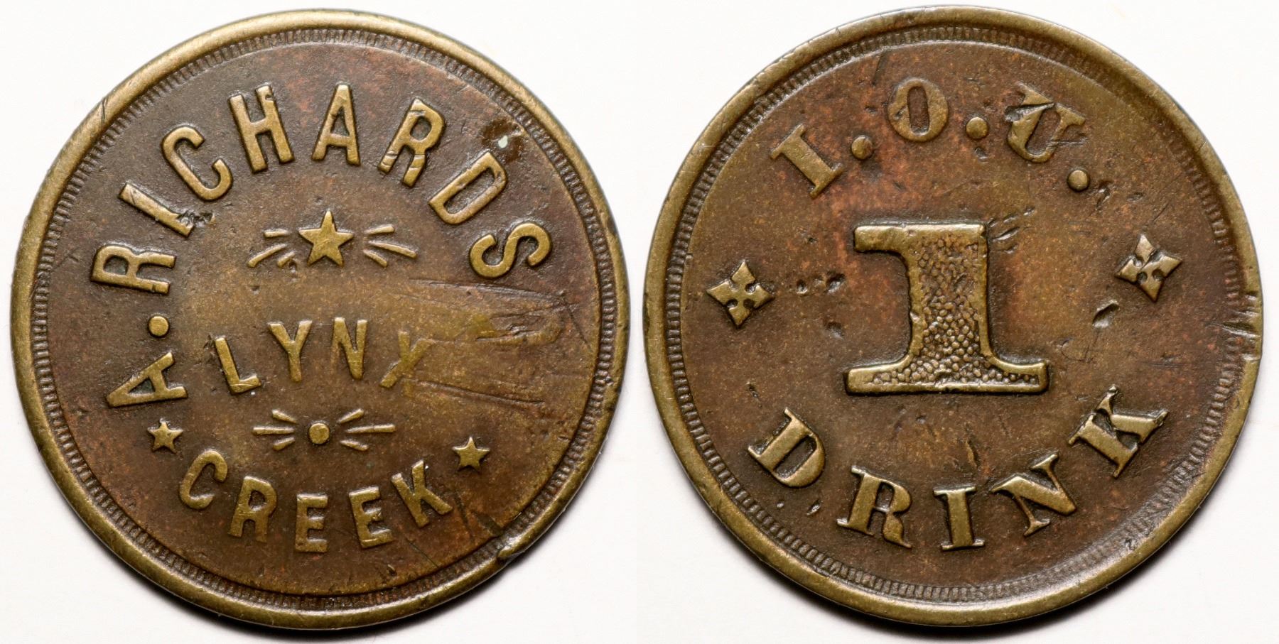 A. Richards/ Lynx / Creek // I.O.U / 1 / Drink. Choice R8 1899-1900. Initial panning along Lynx Creek yielded $4.80 in gold. Sam C. Miller, a member of the Walker party, shot a lynx nearby, and the creek got its name.