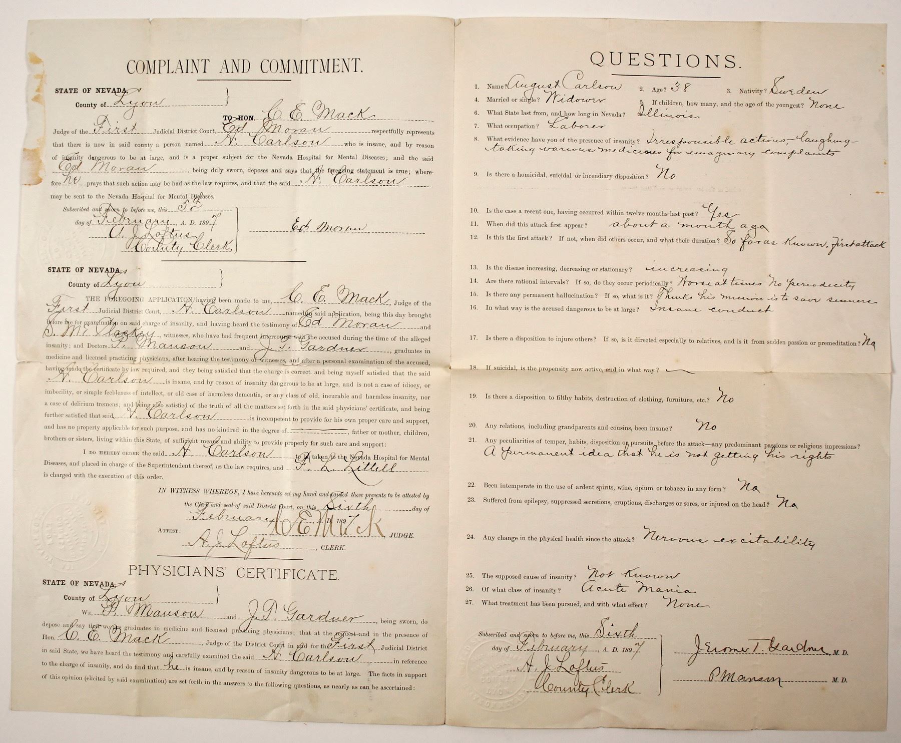 Unusual Lyon County District Court document, "In the Matter of the Insanity of A. Carlson." Judge C.E. Mack orders that August Carlson, a 38 year old laborer from Sweden, shall be committed to the Nevada Hospital for Mental Diseases. Dated February 6th, 1897. The decision is based off of a complaint filed by Ed Moran. Includes questionnaire filled out by doctors P. Mausou and J.T. Gardner. The answers are interesting. What evidence have you of the presence of insanity? "Irresponsible actions--laughing--taking various medicines for imaginary complaints." Is there any permanent hallucination? "Thinks his mission is to save sinners."Folded, opens to 16 x 20" Some soiling, tears. Fascinating peek into early mental health care. Unsure if they were living in Silver City or Dayton. Date: 1897 City: Lyon County State: Nevada HWAC# 77379