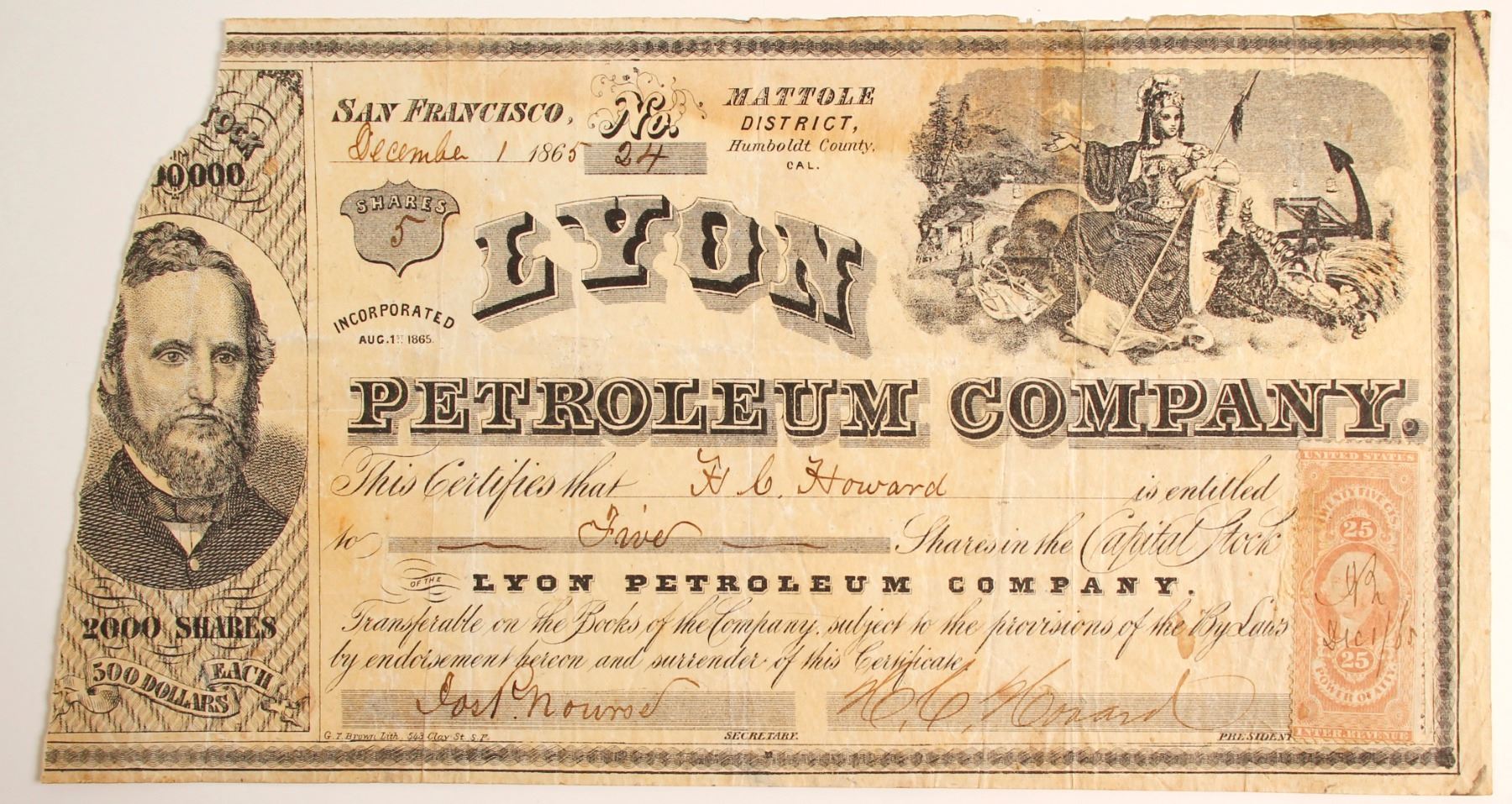 # 24 for 5 shares to HC Howard. Datelined San Francisco 1865. Signed by secretary James Monroe and president HC Howard. 25c Power of Atty Revenue stamp. Allegorical vignette on right and portrait of ? on left. Uncancelled. Location listed as "Mattole District, Humboldt County, Cal." Original trustees were Minor Martin, HC Howard and Joshua Lyon (hence the name of the company). This stock has seen the wear of 150 + years. left side has been completely torn off. State: California City: Mattole District, Humboldt County Date: 1865