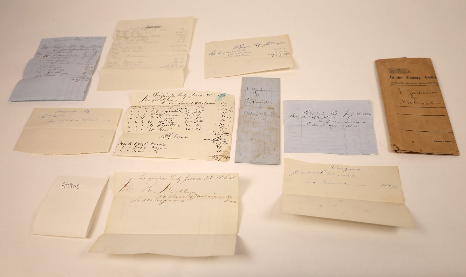 Large, fascinating list of creditors of Lyon Zacharia filed in Nevada County, California. Zacharia ran a cigar and liquor store in Virginia City, Nevada. Also, a large group of handwritten receipts with Virginia City at the top. Also, an interesting one page document stating that the Insolvency Notice was run in the Grass Valley National, a daily paper published in Nevada County. Signed by the Justice of the Peace of Nevada County in 1865. Zacharia had a Grass Valley store in October, 1862 and in Virginia City in May, 1863.