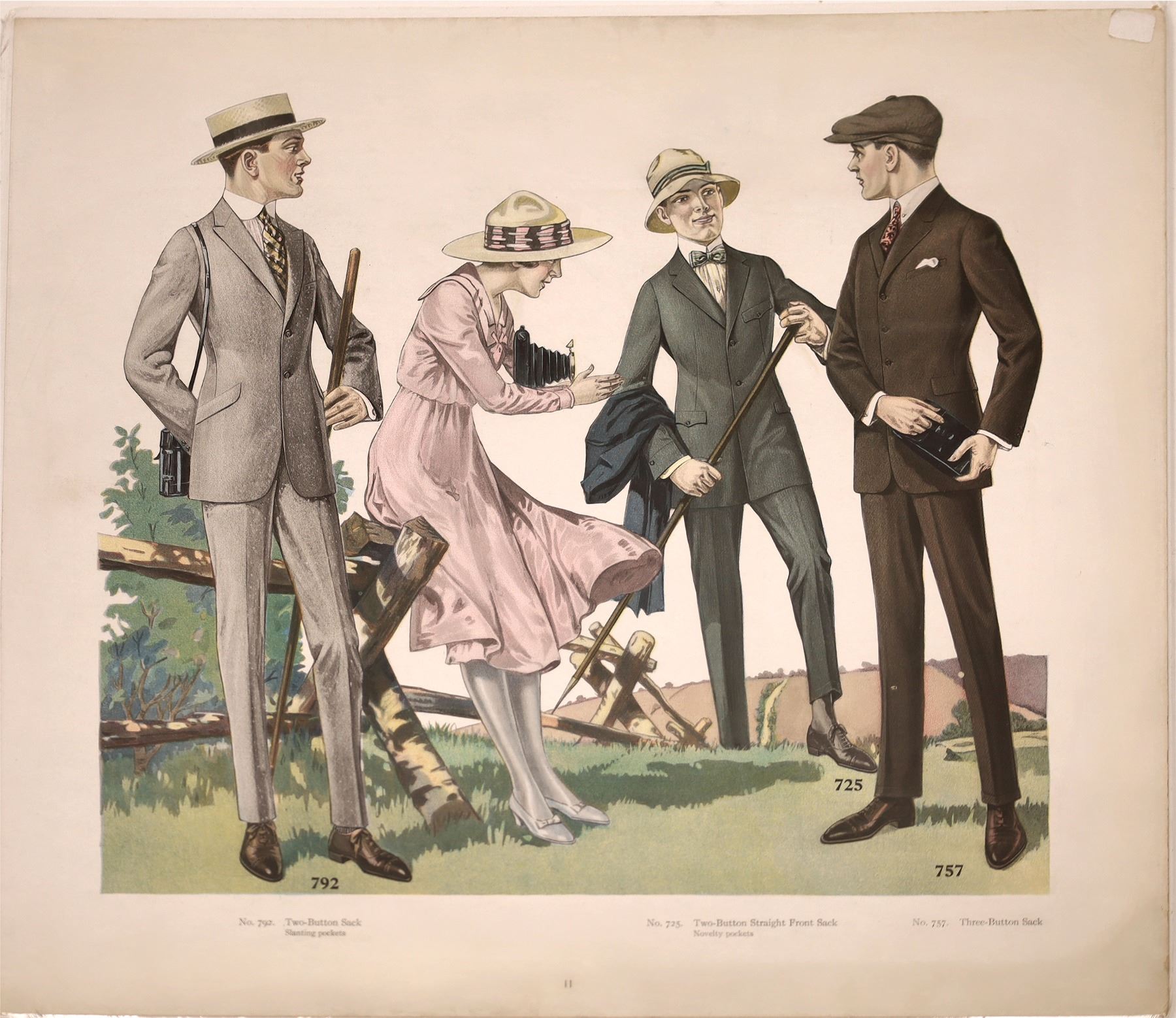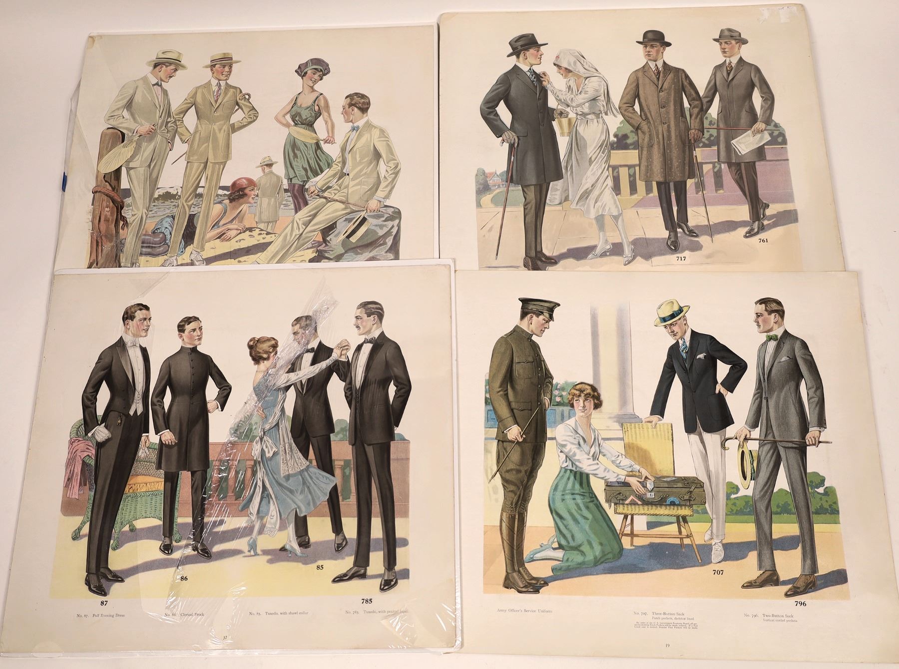 M. Born and Company clothiers (of Chicago) built clothes to be worn world-wide. This lot contains five large plates depicting fashions available for the spring and summer of 1919. Interestingly, the U.S. Government Economy Board specified unlined pockets on dress cloths. Presumably in conservation during wartime, but the war was over in November of 1918. Women's and children's clothes are always shown in the background. One broadside has several cloth swatches on the flipside. Each one is 17.5 inches X 19.5 inches some soft corners but ready for framing, in very good condition. This is how fashion was advertised a century ago.