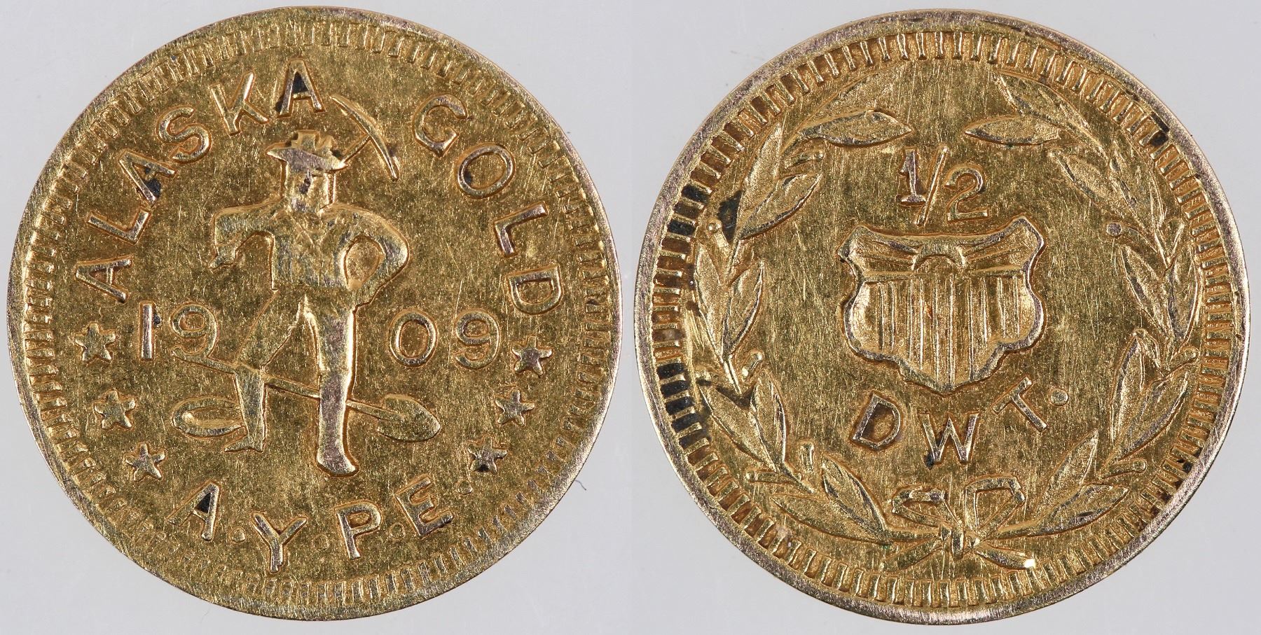 Obverse: gold miner with a pick swung over his shoulder. Between his legs is a shovel and a gold pan. 1909. Reverse: a wreath, a shield, and 1/2 DWT (abbreviation for pennyweight.)