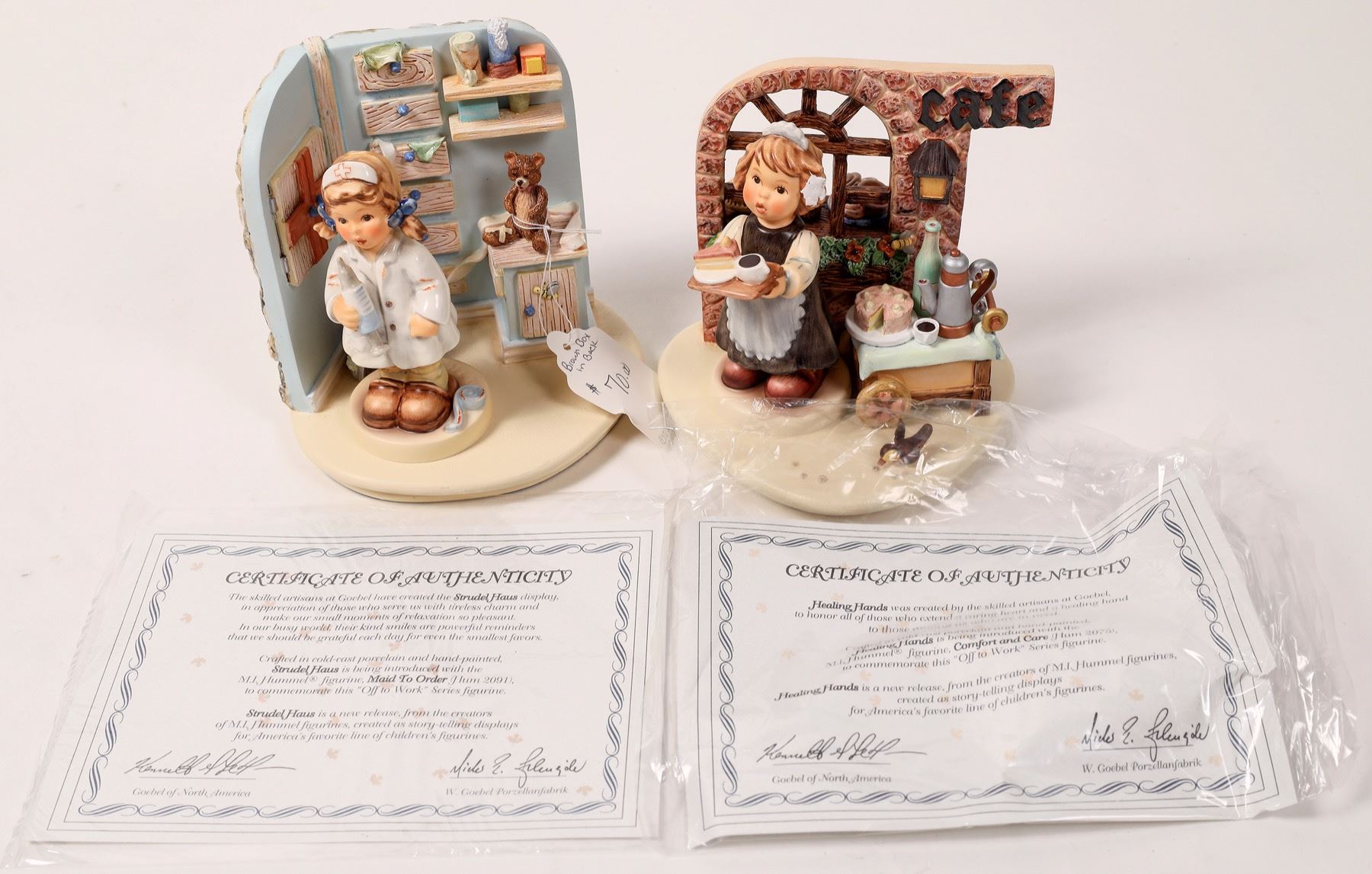 1. Healing Hands with the figurine Comfort and Care, as part of the "Off to Work" series. With Certificate of Authenticity. A doctor's office room with a teddy bear, A little girl as a nurse holding a big needle. 2. Strudel Haus, with Maid to Order figurine. Contains certificate of authenticity. The outside of a cute cafe. A girl carrying a tray of cake and coffee.