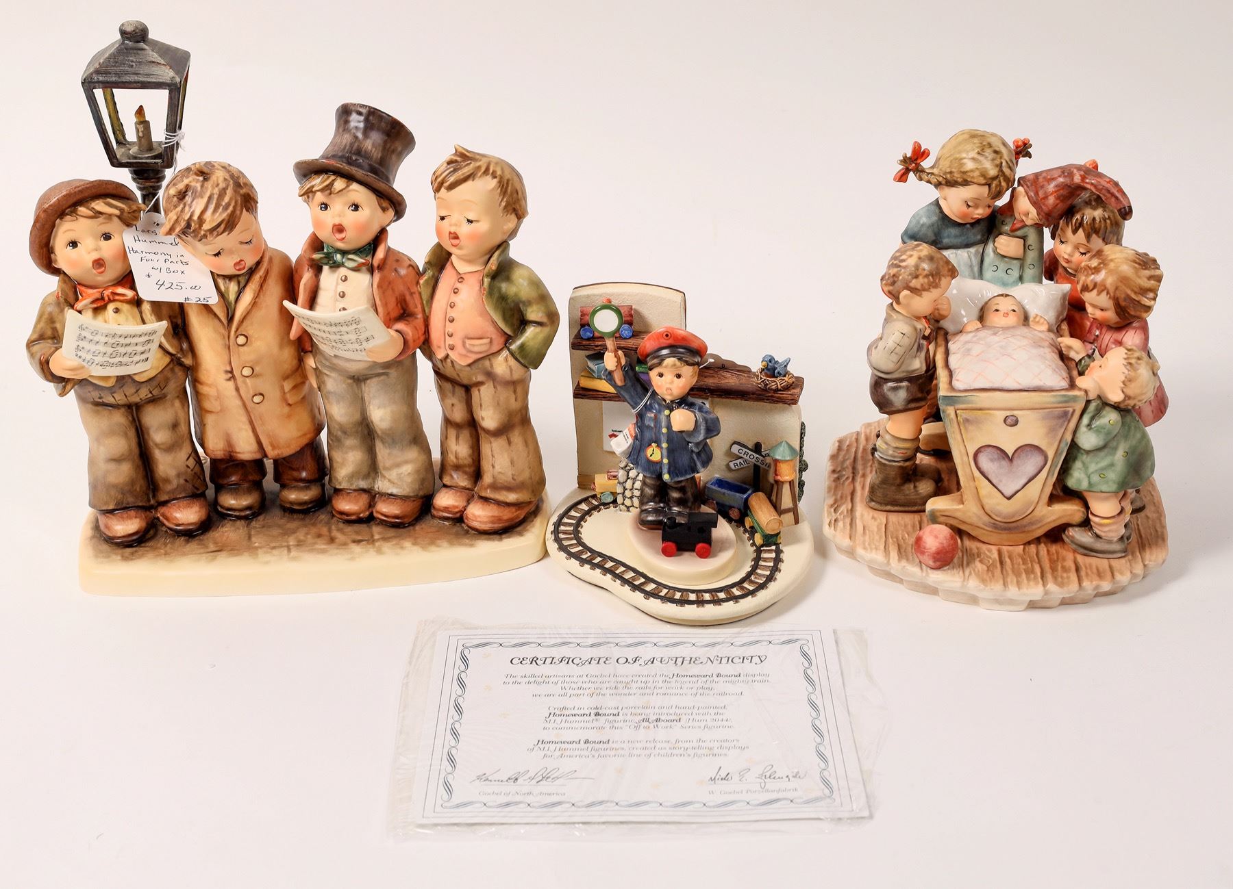 1. Homeward Bound, and figurine All Aboard, "Off to Work" series. With Certificate of Authenticity. Train on train tracks. Boy as Train Conductor figurine. 2. Hum 471 Harmony in Four Parts, 10 inch. Four young boys singing. Century Collection. With Certificate of Authenticity. 3. "Rock-A-Bye" in the Century Collection, Limited Production. Also with Certificate of Authenticity. Children around a baby crib.