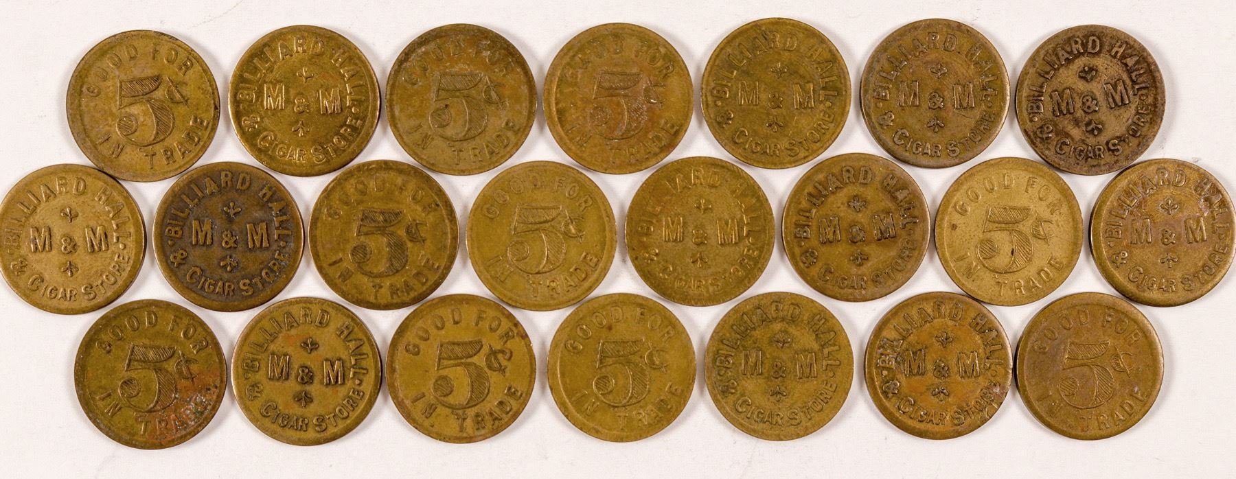 Lot of 22. Obv.: Billiard Hall / M & M / & Cigar Store; Rev.: Good For / 5c / In Trade. Br. rd., 21 mm.