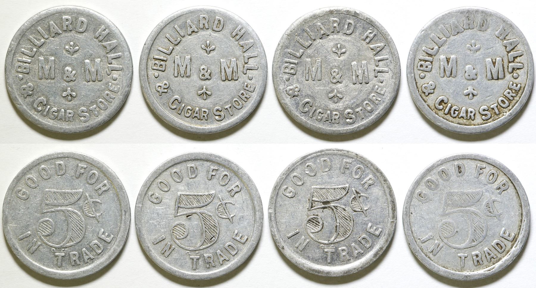 Lot of four aluminum tokens: obv.: Billiard Hall / M & M / & Cigar Store; rev.: Good For / 5c / In Trade. Rd., 21 mm. Mitchell & Mitchell, 1909-1910.