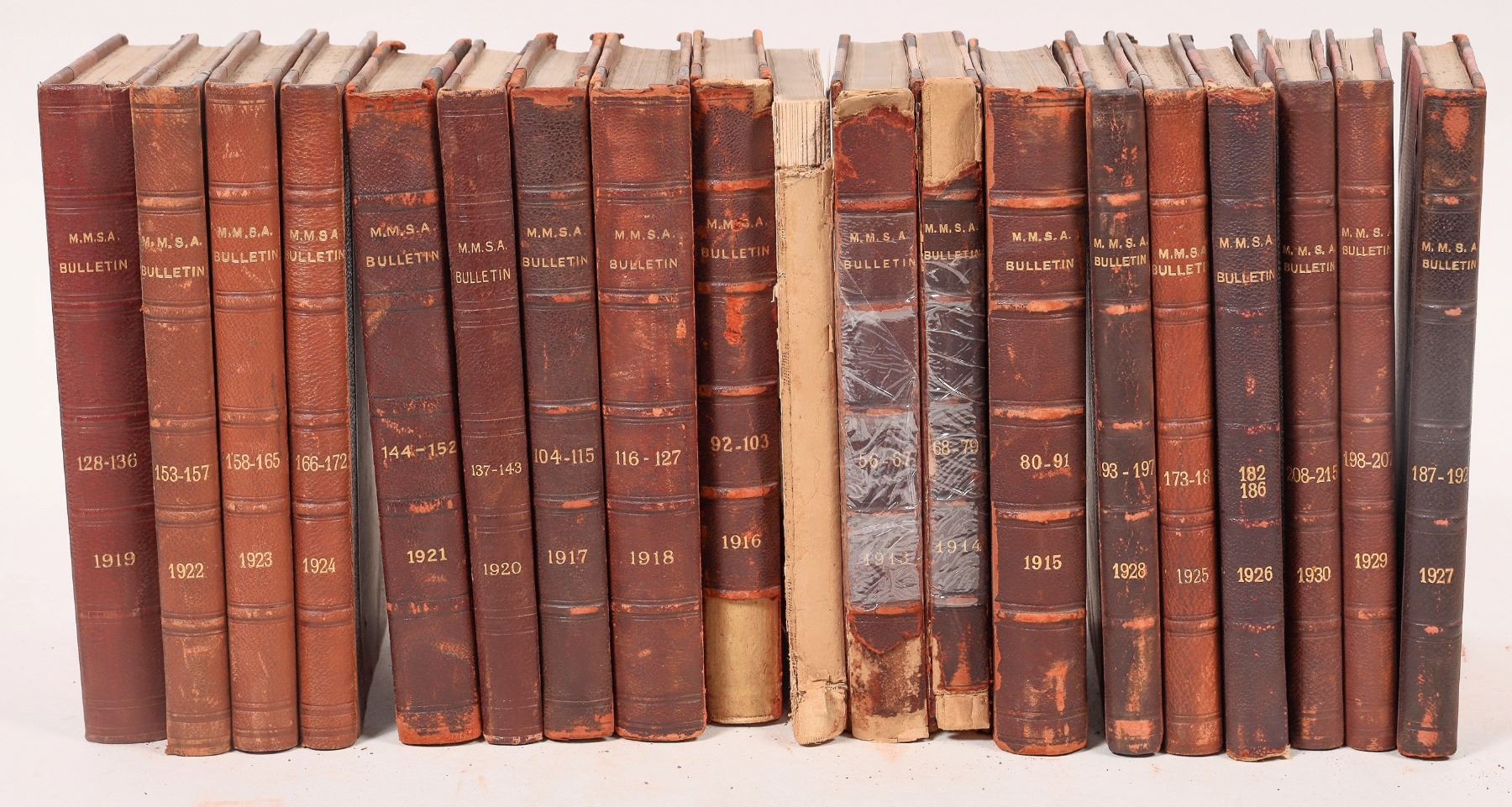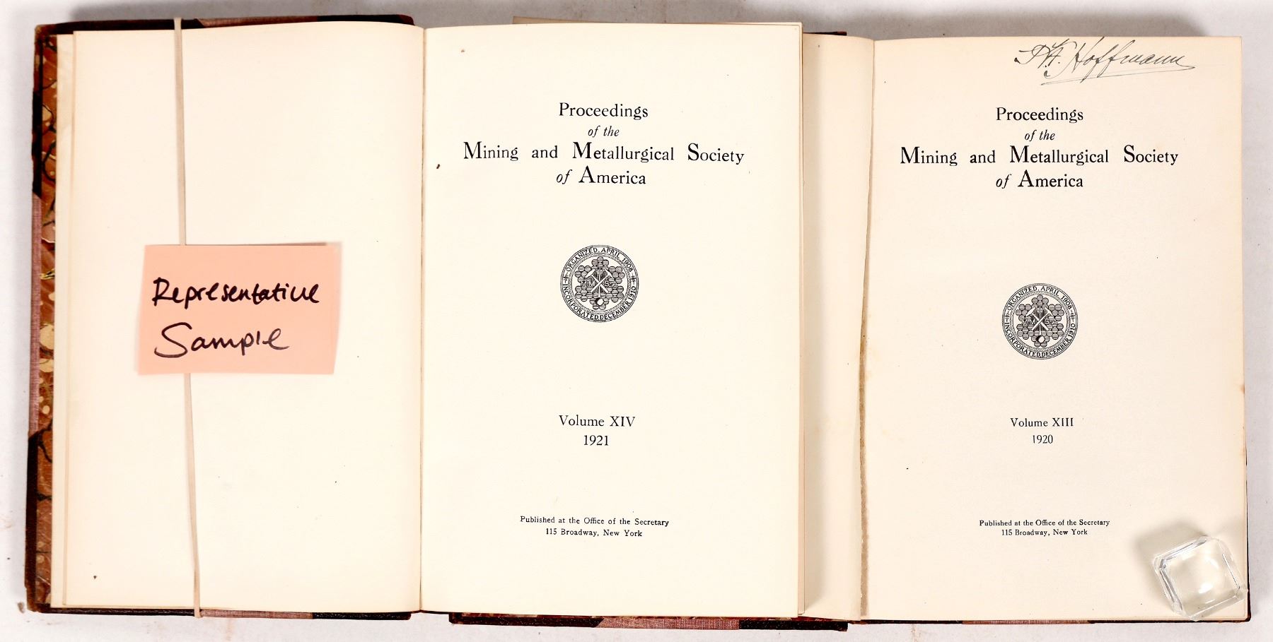 A collection of 19 books from the Mining and Metallurgical Society of America, dating from 1913 to 1930. The books record the minutes of Mining and Metallurgical Society meetings, with transcriptions of speeches and statements from members on such topics as current events, politics, economics, education, and science as they pertain to mining and metallurgy. Indexes at the end of the books list Mining and Metallurgical Society members, specifically sorting them by location. The books are in varying condition; thirteen books are in good condition with minimal/superficial wear, three have significant damage to the spine, and three have entirely detached from their covers. Of these, one is missing a back cover and one has no cover at all. Pages are undamaged.