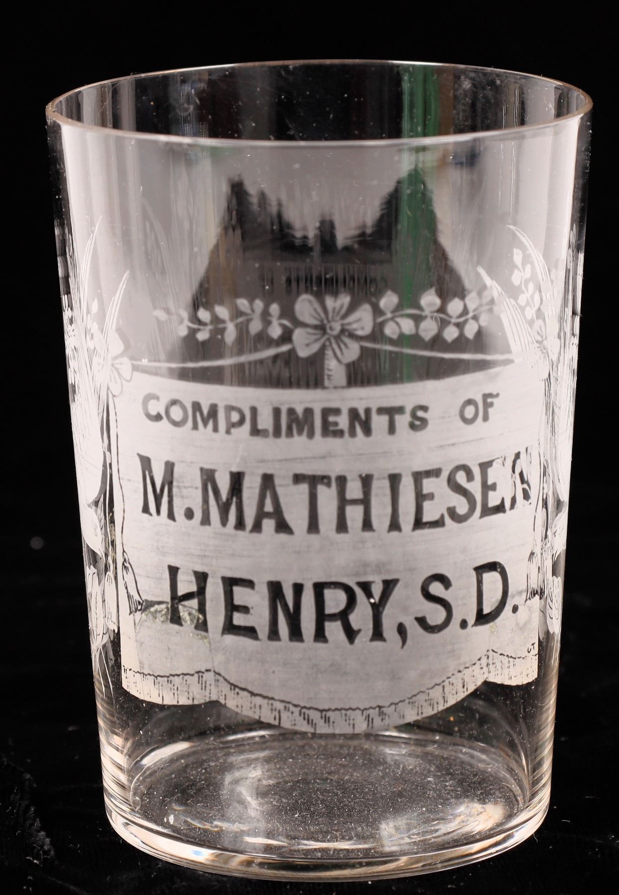 c. 1890-1910 thin wall souvenir beer glass. Compliments of/M Mathiesen/Henry, S D. 3.75" tall. No apparent chips or cracks.