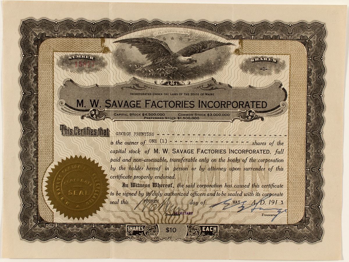 Stock no. 15877 issued to George Prentiss for 1 share on May 4, 1913. Incorporated under the laws of the state of Maine. This stock has very little wear except for some creases. Uncancelled. The company was a large mail order house located in Minneapolis. "This company handles merchandise of all descriptions, and the average farm and home owner can supply his entire needs from its mammoth stocks. In the busy seasons nearly seven hundred people are required to handle its business." Prag Collection. City: State: Minnesota Date: 1913 ID# 189