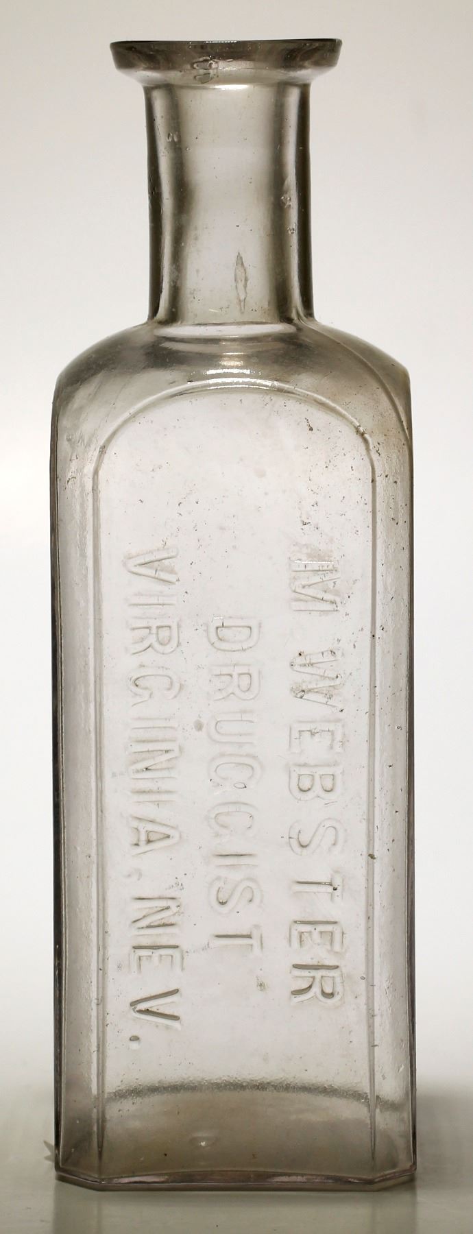 M. Webster / Druggist / Virginia City // Base: Mc C ( Stands for : William Mc Culley & Co / Pittsburgh.) // Square, Clear, tooled top, 5 7/8" x 1 7/8" in size. Perfect, like a brand new bottle. Nice flared lip, Rare bottle..(RH).
