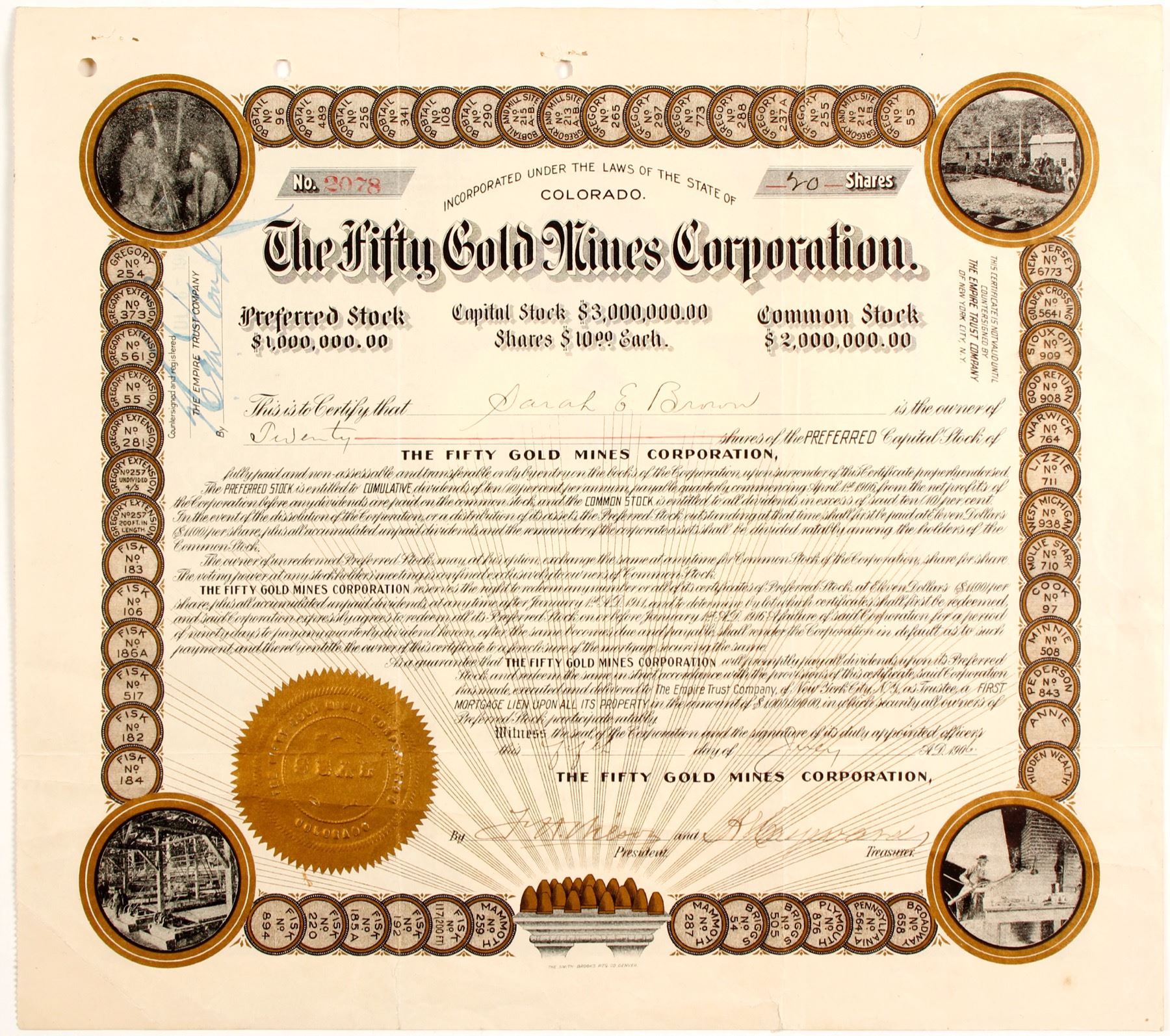 Extremely Rare! This certificate is sure to catch your attention as an investor. Large size. Four real photo vignettes. Fifty-four individual mines listed in Circles on border. Gold Seal. Fancy Script. Number 2078 for 20 shares to Sarah E Brown. Signed by A Hayward and president F Wilson. Dateline 1906. The Smith Brooks Printing Company of Denver outdid themselves on this one! Uncancelled. Heavy folds, staple holes three large holes for storage. Still a striking piece. Mining near Blackhawk on the Gregory, Fisk, Cook, Bobtail and Mammoth veins and their branches and on several minor veins has in recent years been controlled by the Fifty Gold Mines Co. The properties under this management have been among the most productive in the district but were unfortunately closed down. [Professional Paper - United States Geological Survey] The 1909 Moody's said this about the Fifty Gold Mines Corporation in 1909. The Fifty Gold Mines Corporation is an enterprise which has gone through some difficulties but being a property which is well considered it has a chance to come out successfully thought it must have more capital. When a mine is in a difficult position it is more frequently brought to worse than better conditions. In 1910 the company was in bankruptcy court. Prag Collection. State: Colorado City: Black Hawk District, Gilpin County Date: 1906 HWAC# 81907