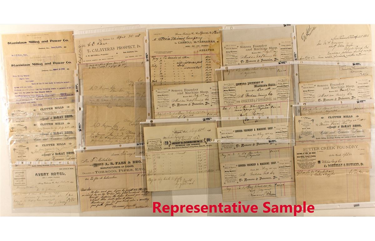 A COLLECTOR’S DREAM! 140 pieces from small Calaveras County towns. Many, many billheads. Mostly unique! Includes Calaveras Prospect billhead, Valley Springs, Sutter Creek, San Andreas, Stanislaus Milling billhead from Oakdale, Coulterville letter, Avery Hotel letterhead, Clipper Mills letterhead, 6 Sonora Foundry billheads in three different styles, AS Fass cigar billhead from Sonora, Scott, Davis & Co. from Soulsbyville, Wm Felker & Son blacksmith billhead, Rosenwald & Kahn dry goods Plymouth billhead, 38 pieces datelined Knights Ferry and Robinson Ferry (Calaveras Consolidated Gold, Harrold, Tulloch, & Son, etc.), Eagle Hotel from Sheep Ranch, bill from Joseph Ratto for filling bags of sulphurets, Alvina Hayward and C. C. Lane stage coach expenses, Valley Springs Hotel, W. H. Wolf and G. Reinhaus billheads from French Gulch, Rich Gulch receipts, E. N. Matson and James Woodcock billheads from West Point, Geo. J. Porteous assay letterhead about the Lickin Fork Mining Company, etc.