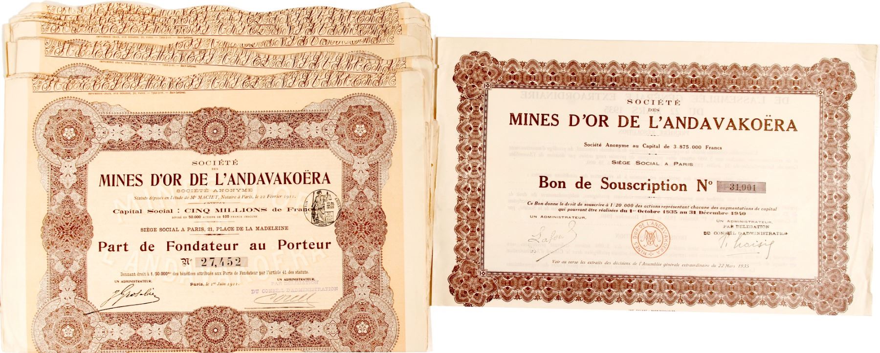 33 stocks certificate # 27452 MINES D' OR DE L'ANDAVAKOERA, Part de Fondateur au Porteur. With a scale of Justice. Variety of coupons. Very good condition. Signed by DU Consell administration. 1 Bon de Souscription No. 31001 dated October 1st 1935 and December 31,1940. Very good condition. (MF) France Paris