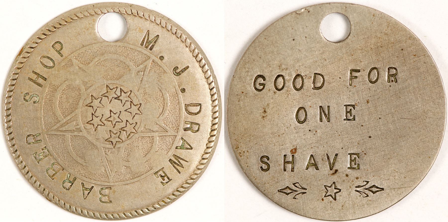 Round brass 27mm M. J. DRAWE BARBER SHOP // GF ONE SHAVE. Rare choice early token.Punched hole. HWAC# 62304 Date: Pre 1900 Location: Fayetteville, Texas