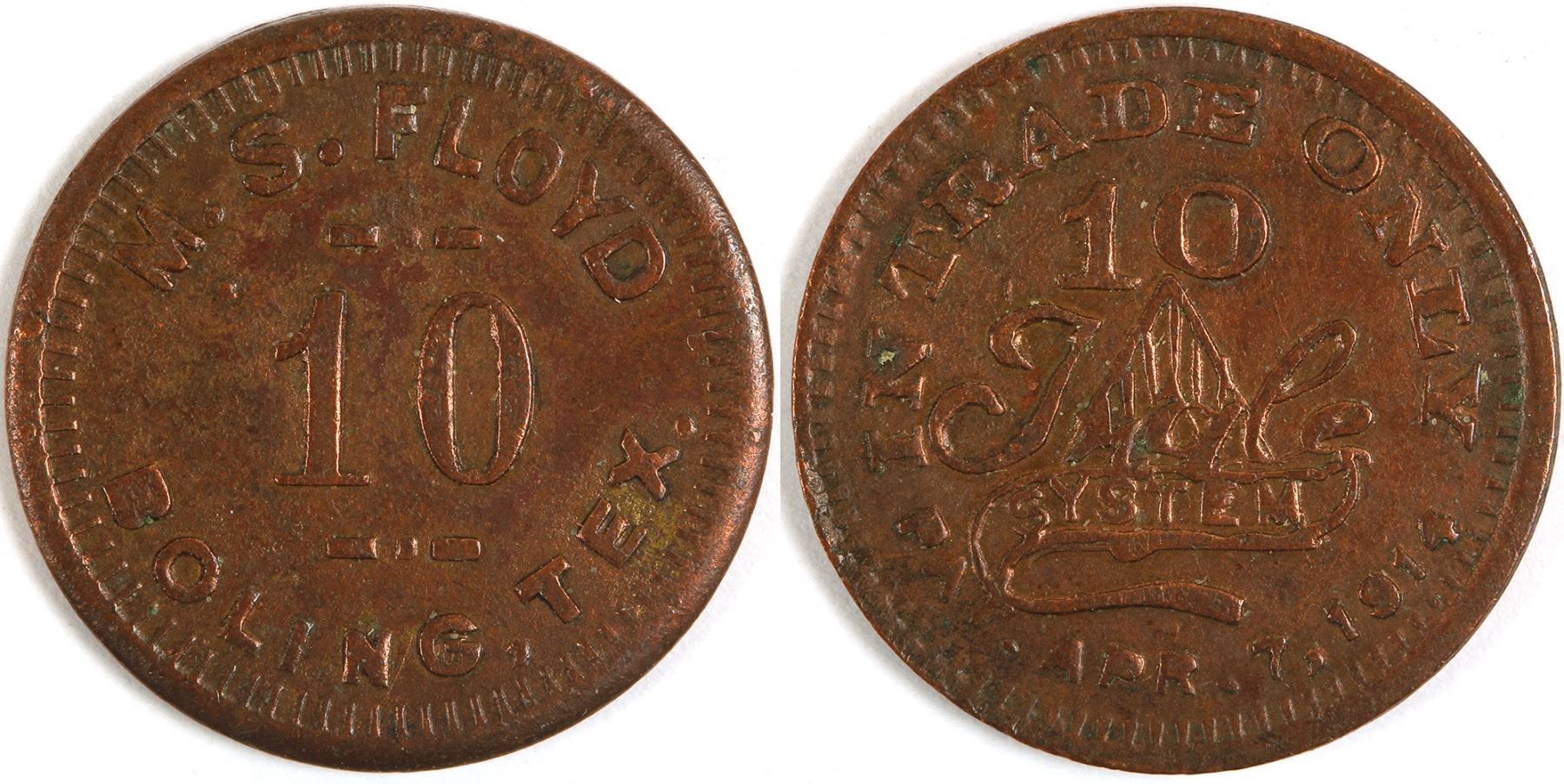 Round brass 21mm M. S. FLOYD / 10 BOLING, TEX. // ITO 10 / INGLE SYSTEM PAT. APR 7, 1914. Rare town, this denomination not listed in Adams HWAC# 62313 Date: Location: Boling, Texas