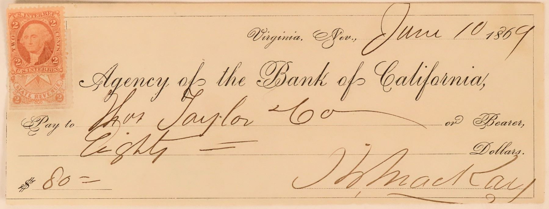 Clean 1869 Bank of California check issued to Thos. Taylor & Co. and signed by "Bonanza King" John Mackay. US IR and NV adhesive revenue stamps. Spindle cancel. Not signed on the reverse. Large, clean Mackay autograph. Thos. Taylor & Company were importers and wholesalers of wines & liquors in San Francisco and Virginia City. They established a presence on the Comstock in 1863 and are well-known to bottle collectors for their embossed Virginia City whiskies. For more background on Taylor, please see Volume One of the Nevada Bottle Book.
