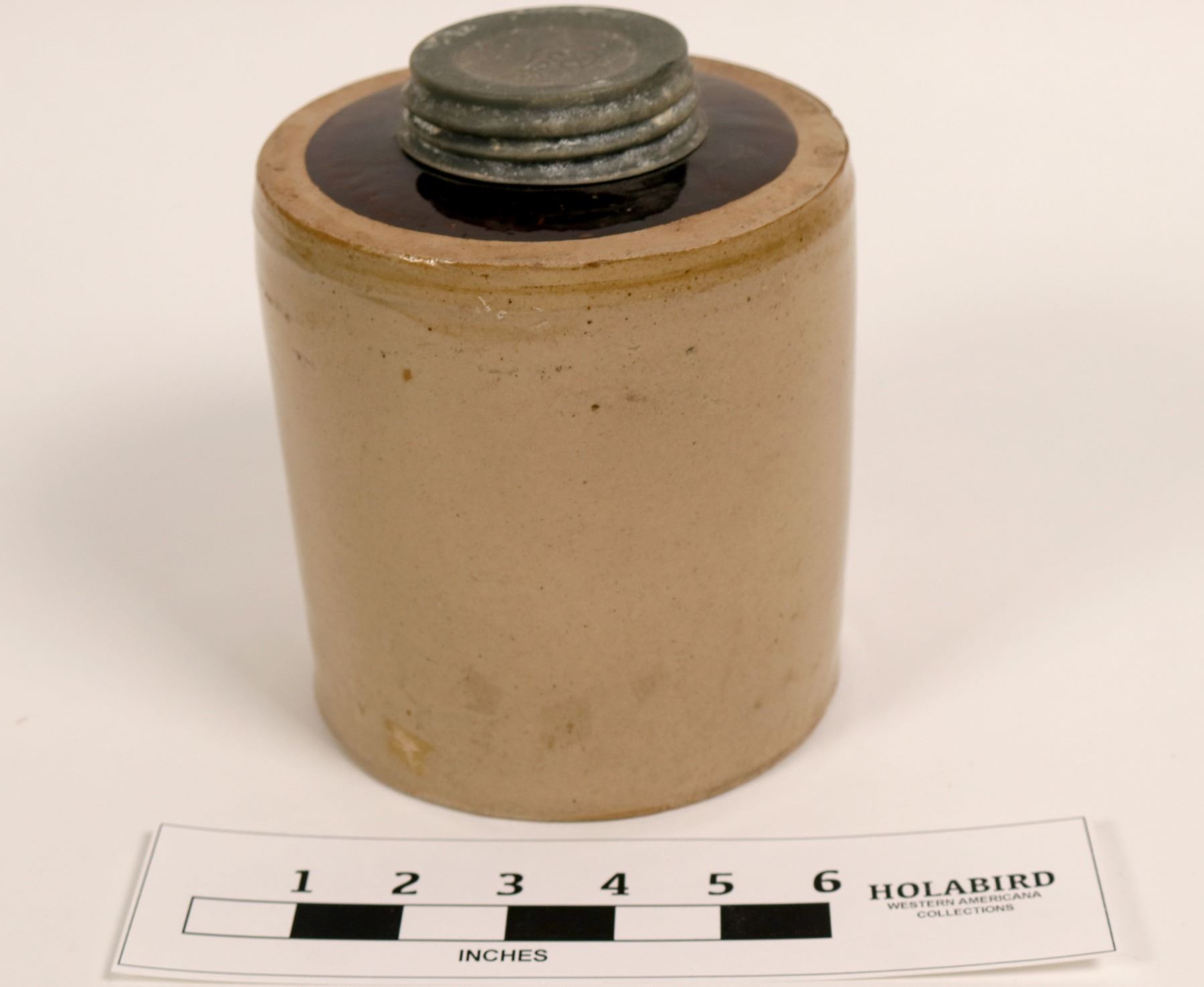 This is a pottery jar made by Macomb with a lid. Two colors with screw tip. 7 in. tall. C. 1900.