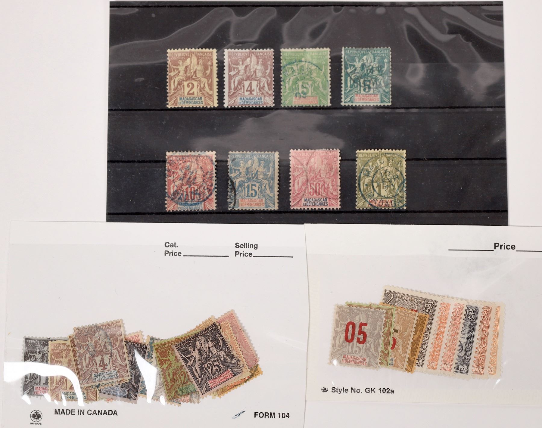 About 24 Madagascar stamps, mint and cancelled. 1-75 denominations, 1F.