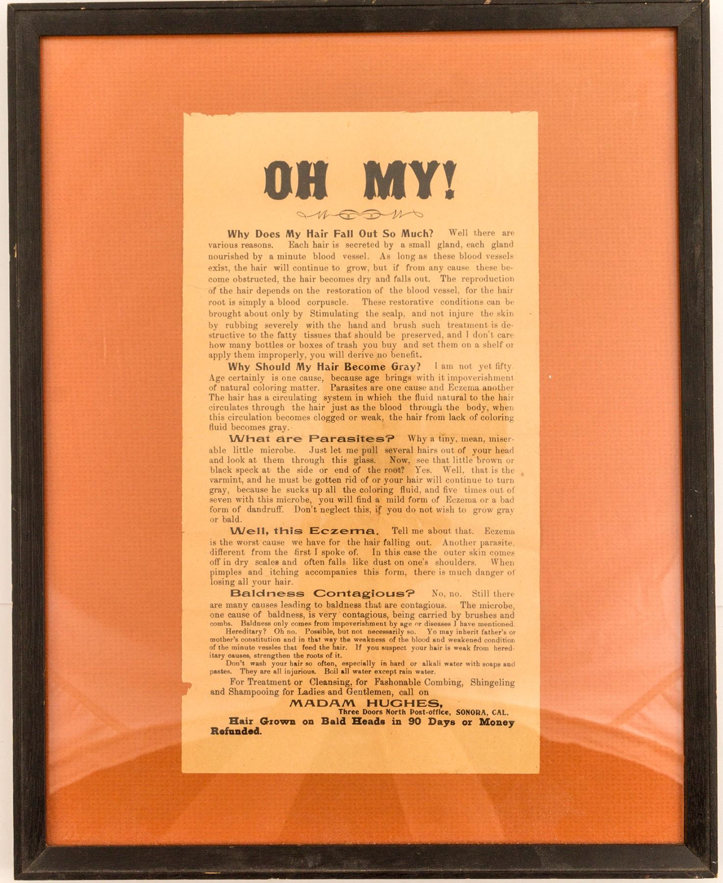 This advertisement comes from Sonora California. The date is unknown but appears to be old. Various claims offers dubious remedy for various hair conditions, including Hair Grown on Bald Heads in 90 Days or Money Refunded.