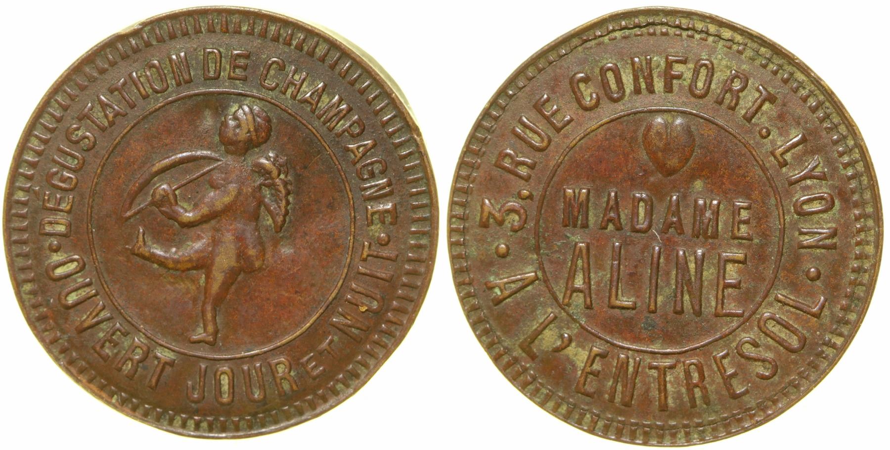 Obv.: 3 Rue Confort. Lyon / Madame Aline / A. L'Entresol; Rev.: Degustation De Champagne / Ouvert Jour Et Nuit. (Champagne tasting / Open Day and Night) Br. rd, 21 mm.
